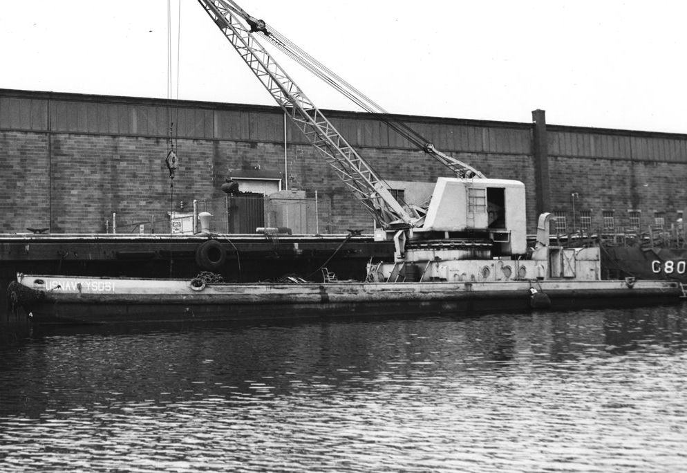 135k | YSD-51 at Philadelphia, date unknown. Note her pilothouse has been removed. Photo by Ted Stone. |