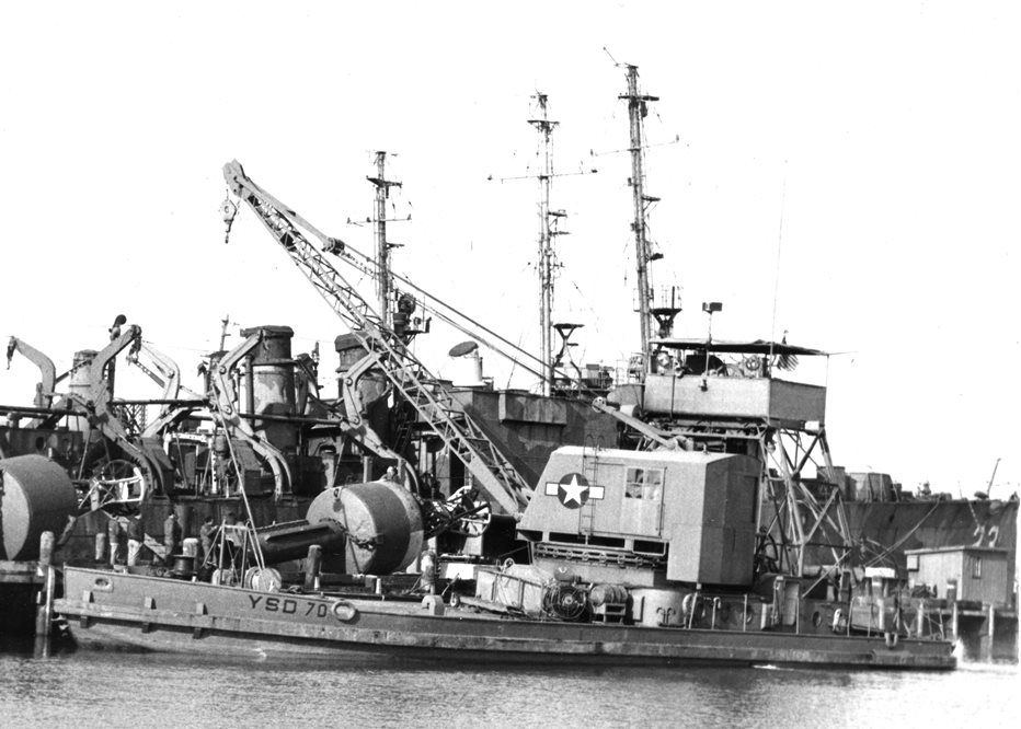 109k | YSD-70 at Cape May, NJ 06 January 1946, apparently in use as a makeshift buoy tender. Note the two four-stack APDs nested in the background, and the naval aviation insignia on the YSD's crane. Photo by Ted Stone. |