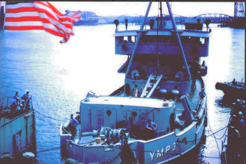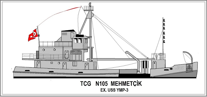 Ex-YMP-3 in Turkish Naval service as TCG Mehmetçik (N 105) tied to a mooring buoy, location unknown, circa 1965. Official Turkish Navy photo. |