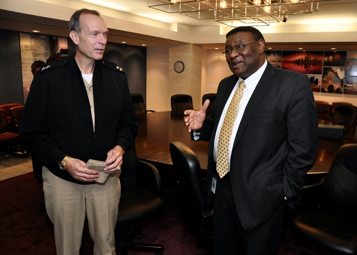 143k | 17 September 2014: Detroit, Mich. - Rear Adm. John E. Jolliffe, deputy commander of U.S. 3rd Fleet, meets with Detroit Deputy Mayor Isaiah Mckinnon