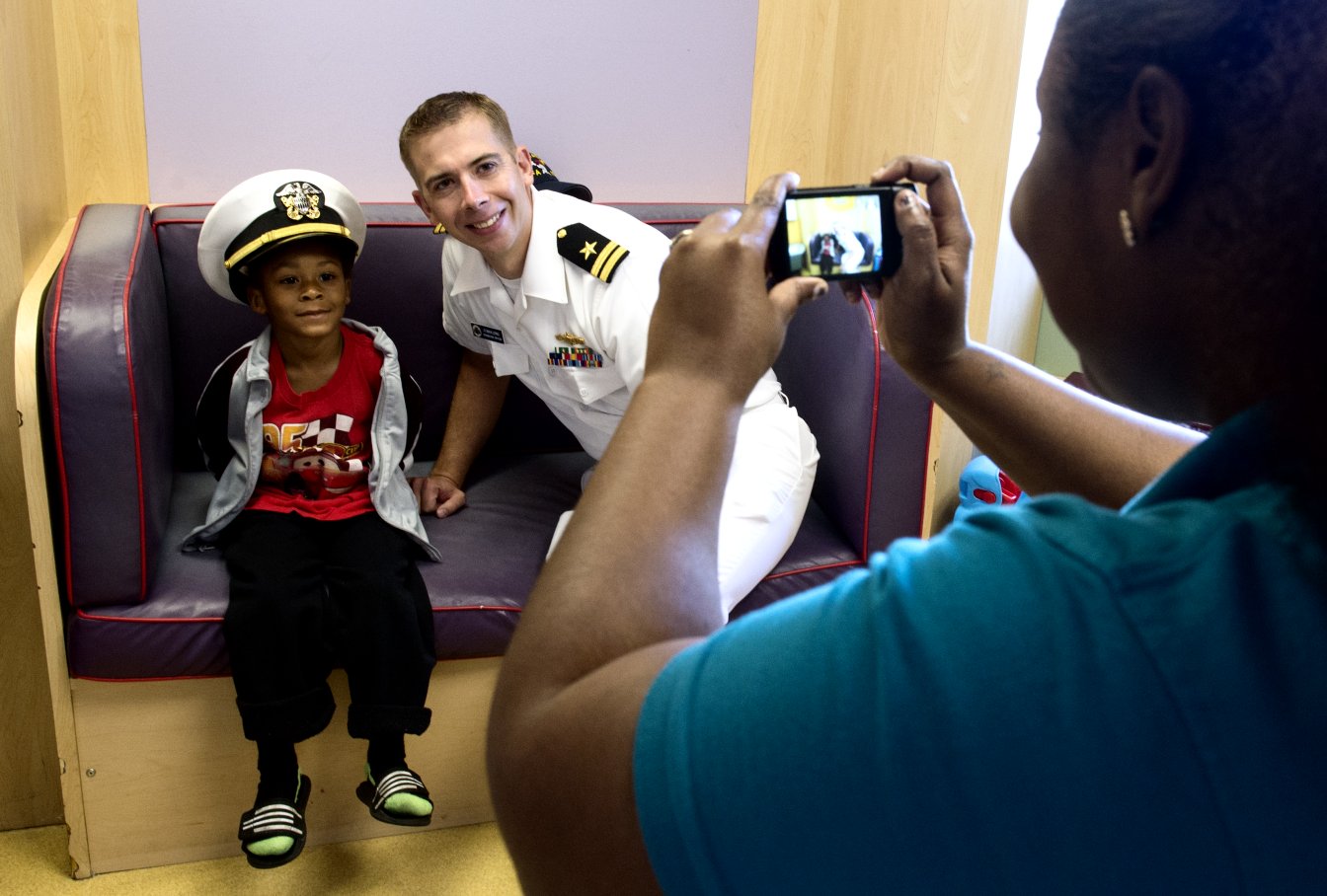 child during a Caps for Kids event at the Children's Hospital of Michigan as part of Detroit Navy Week. Navy Weeks focus a variety of assets, equipment and personnel on a single city