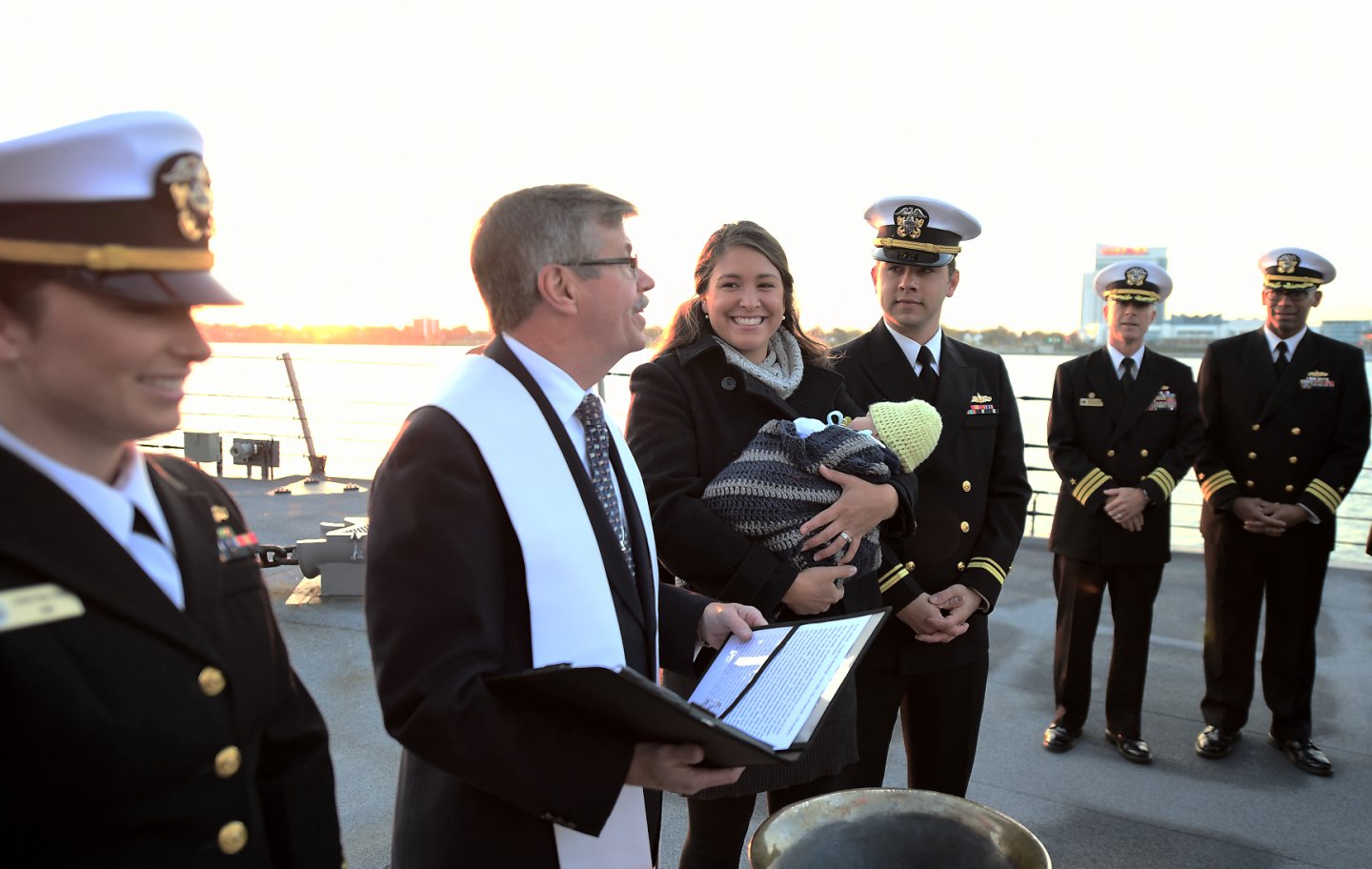 christened. Benjamin was made an honorary plank owner and was christened using the ship's bell containing water from both the Detroit River and the Jordan River in Israel. (U.S. Navy photo #161023-N-VP310-033 by MC1 Richard Hoffner from the Navy News Stand) | ||