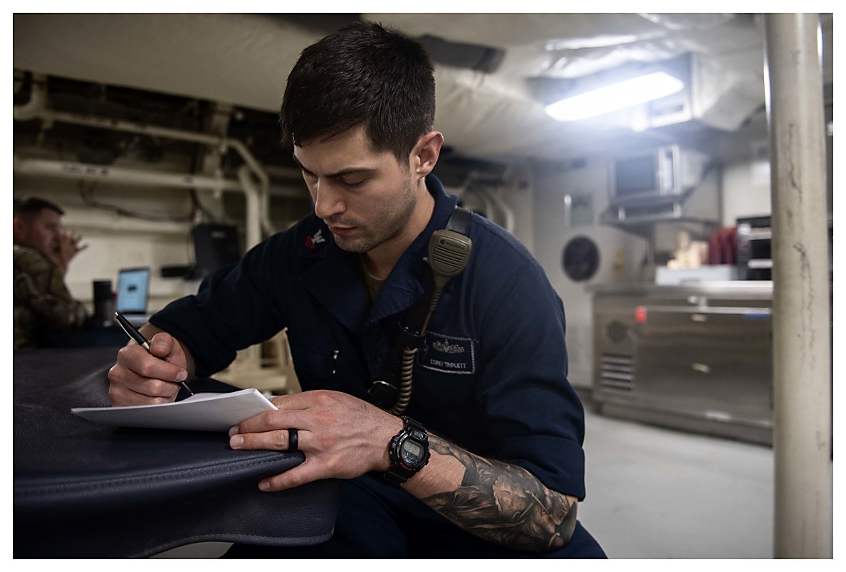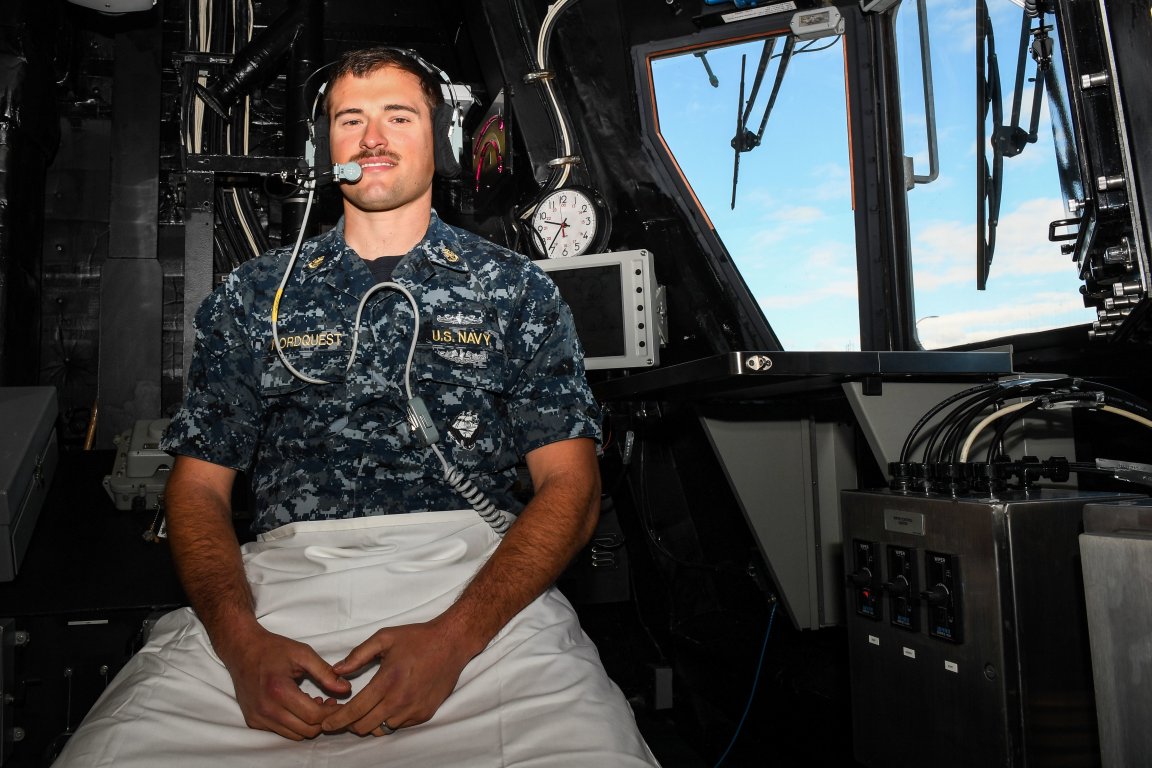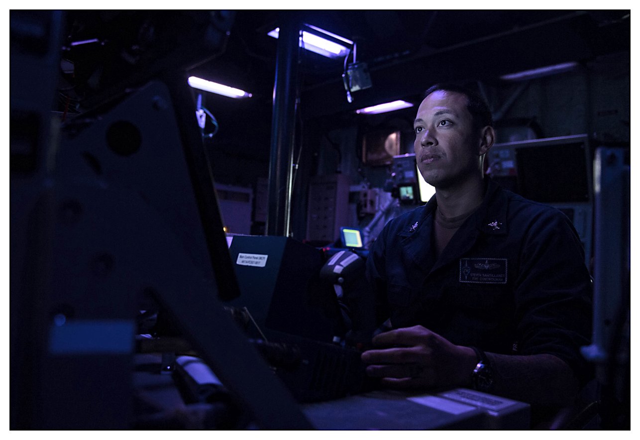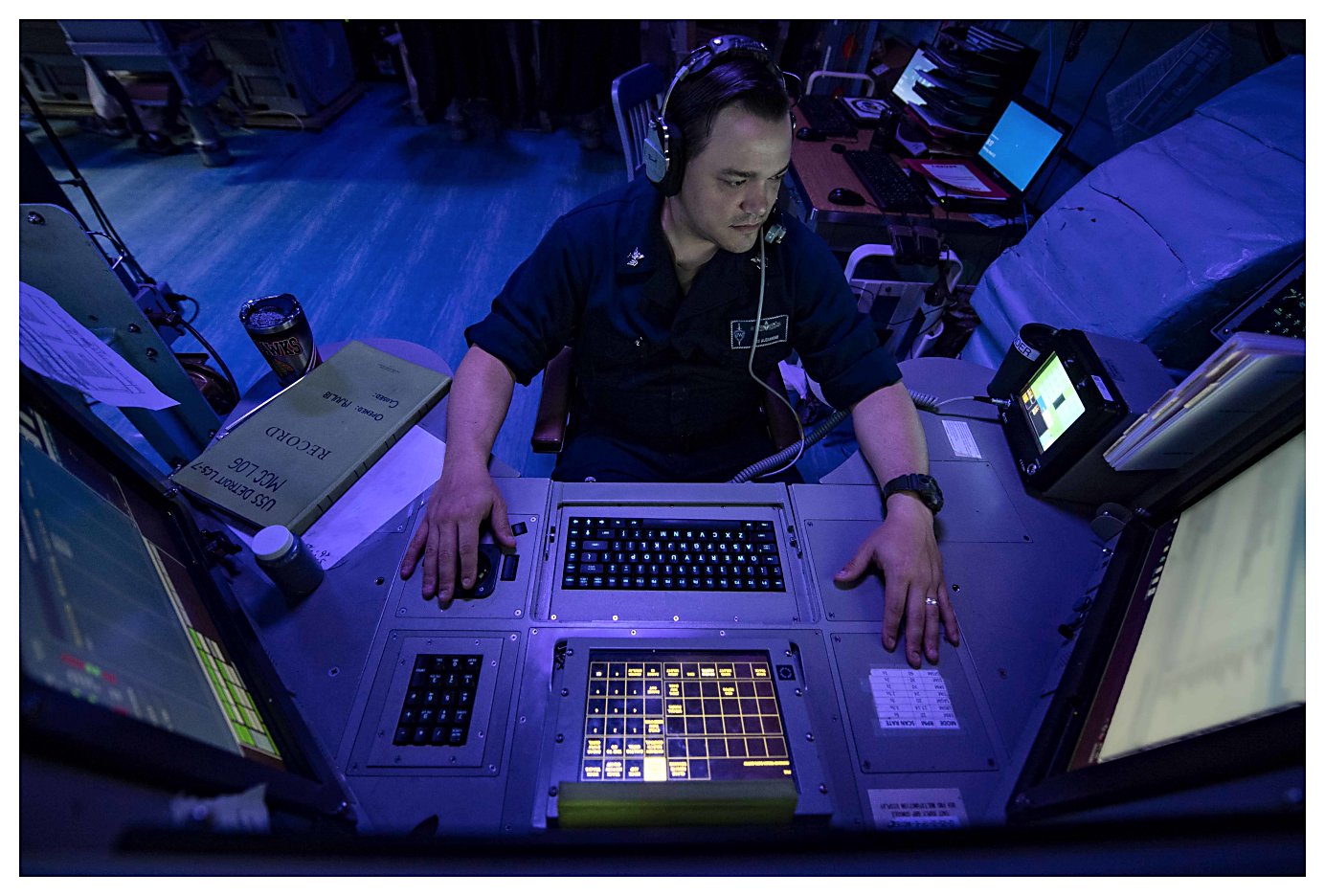 Fireman Jason Constantine while manning the readiness control officer watch in the navigation bridge aboard Detroit. (U.S. Navy photo VIRIN #200325-N-KK394-1081 by MC2 Anderson W. Branch from the Defense Visual Information Distribution Service) | ||