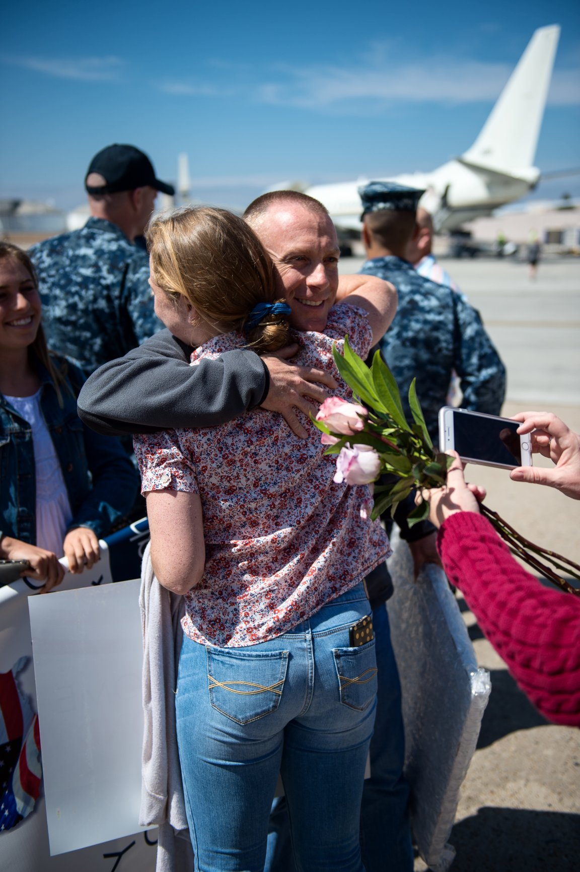 305k | 18 March 2017: North Island, Cal. - Cmdr. Michael Desmond, the commanding officer of littoral combat ship Crew 103, hugs a family member during a homecoming celebration at Naval