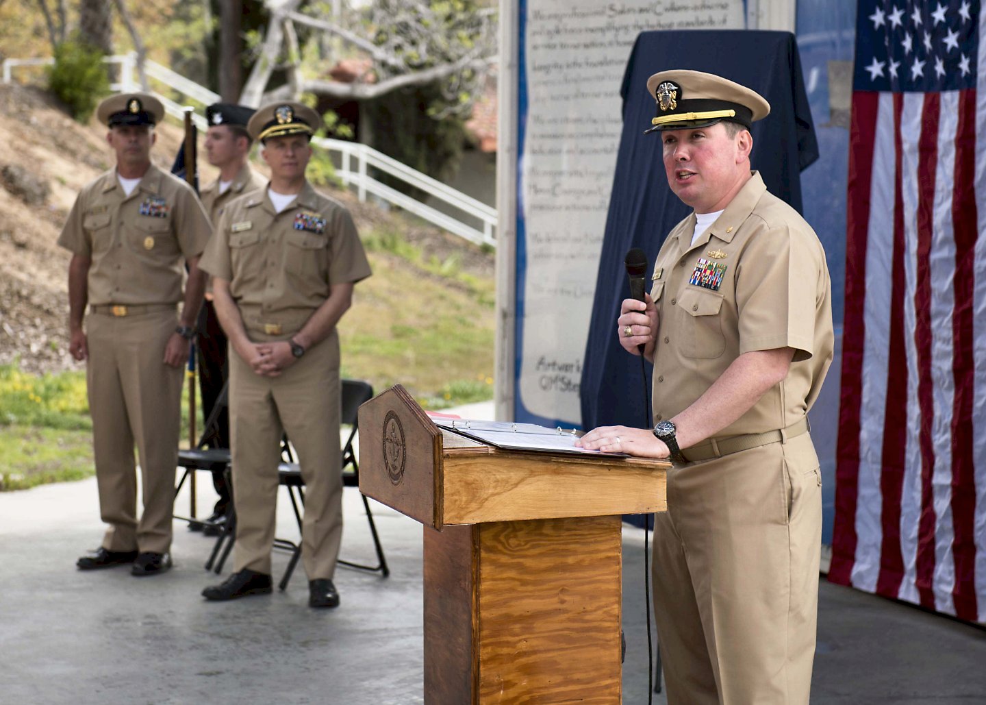 225k | 21 February 2014: San Diego, Cal. - Lt. Cmdr. Christopher Farricker speaks to the crew and family members during the crest unveiling ceremony for littoral combat ship USS