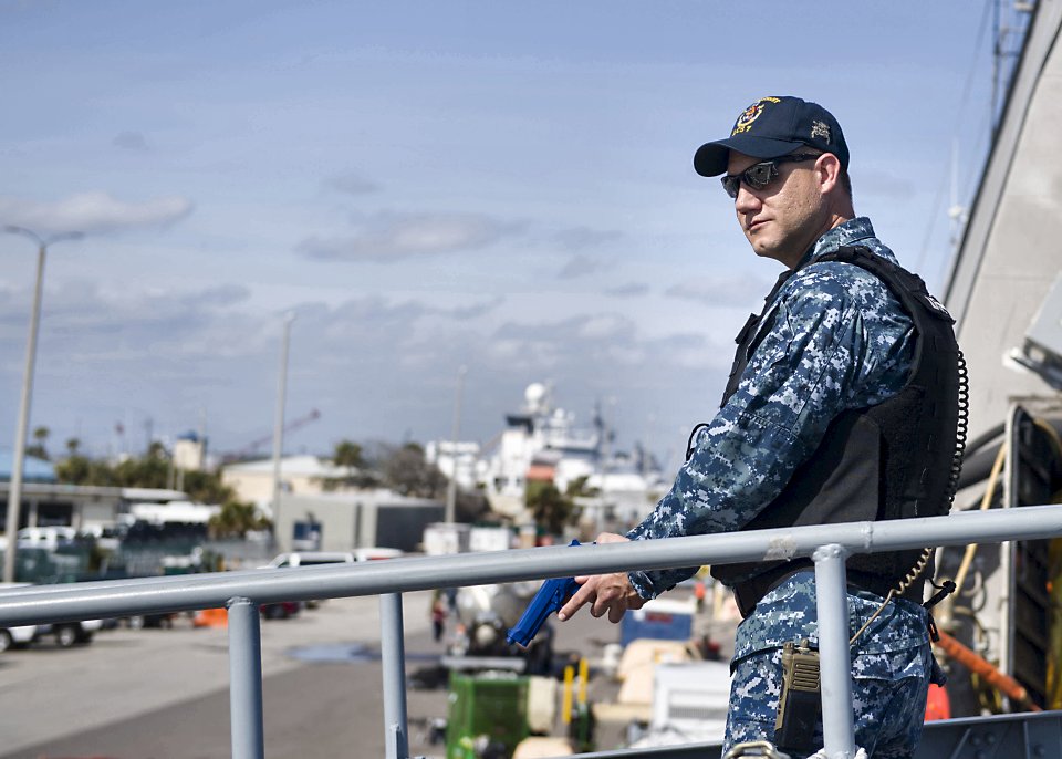 103k | 07 February 2018: Mayport, Fla. - Senior Chief Fire Controlman Ernest Johnson secures the quarterdeck during a small boat attack drill onboard the Freedom-class littoral