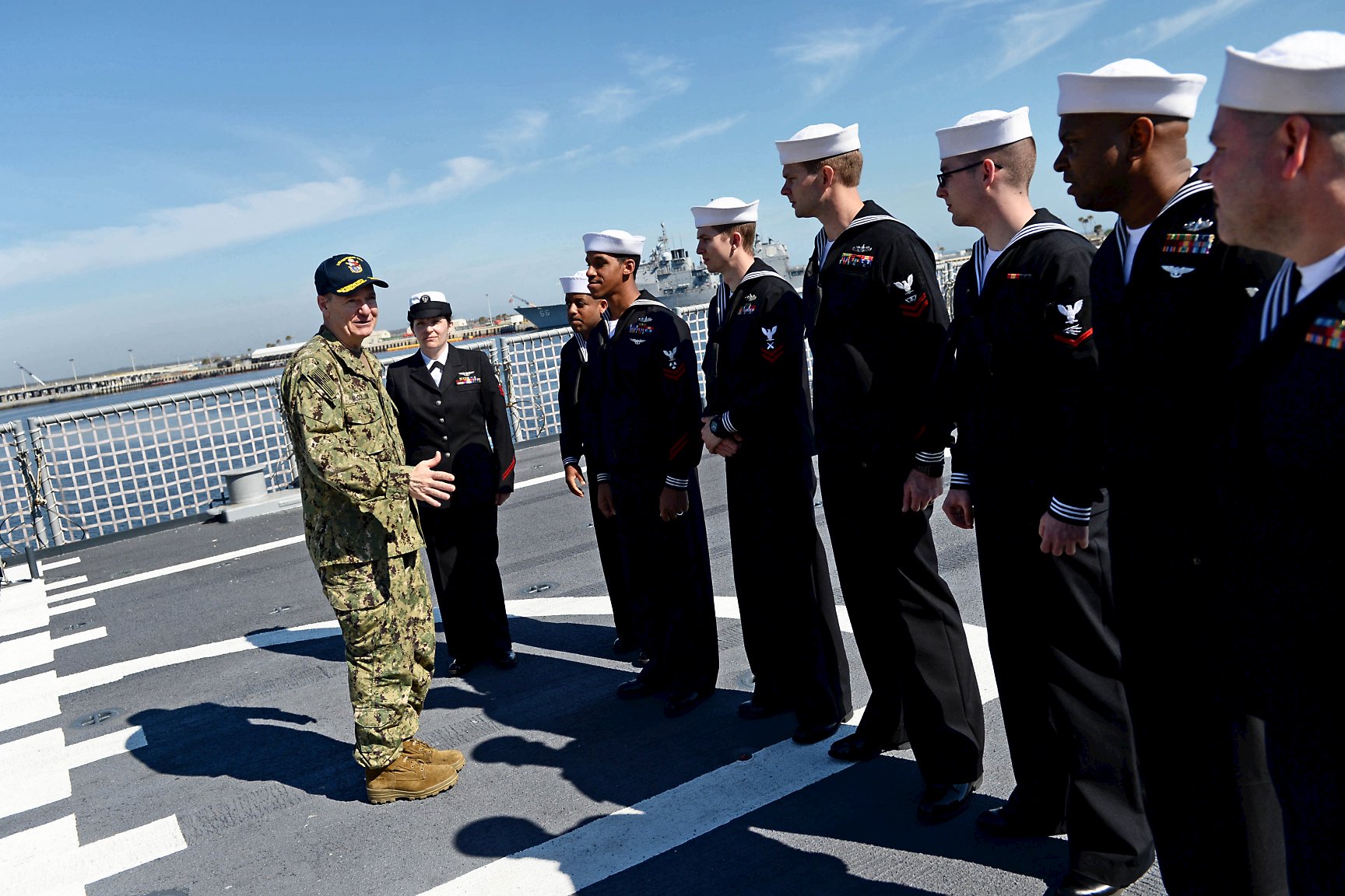 329k | 11 March 2018: Mayport, Fla. - Vice Adm. Luke McCollum, Chief of Navy Reserve and Commander, Navy Reserve Forces, speaks with sailors assigned to USS Detroit
