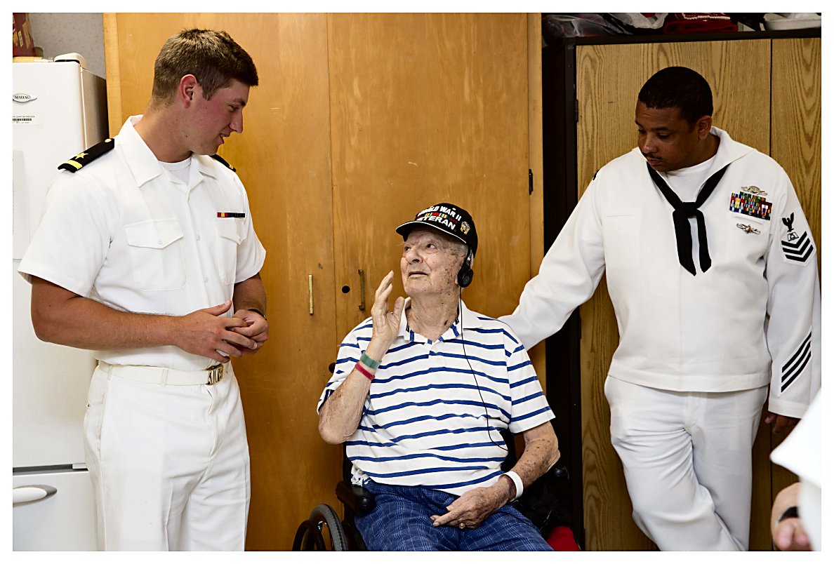 171k | 04 May 2018: Miami, Fla. - Ensign Erik Tokarz (left), and Culinary Specialist 1st Class Derek Prince, assigned to USS Detroit, visit an Army veteran at the