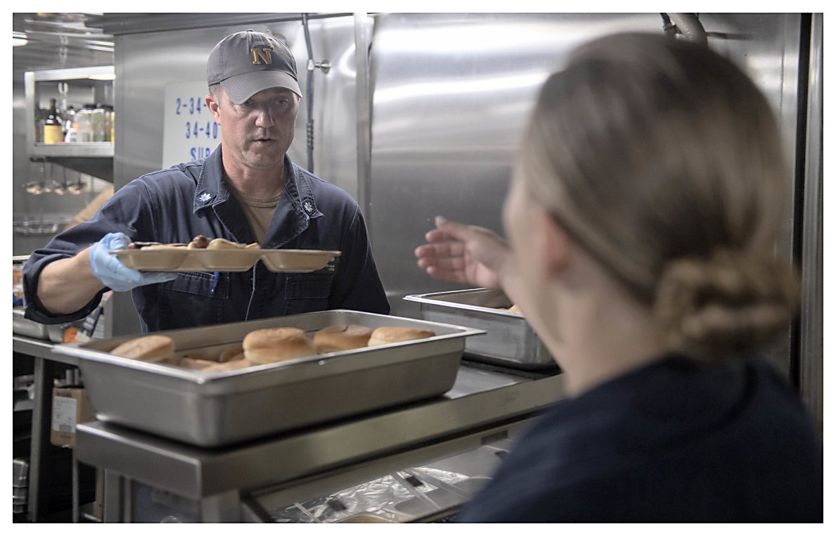 115k | 06 November 2019: The Atlantic Ocean - Commander Howard Meehan, commanding officer, serves food to sailors on the mess decks of Detroit (LCS 7). During this