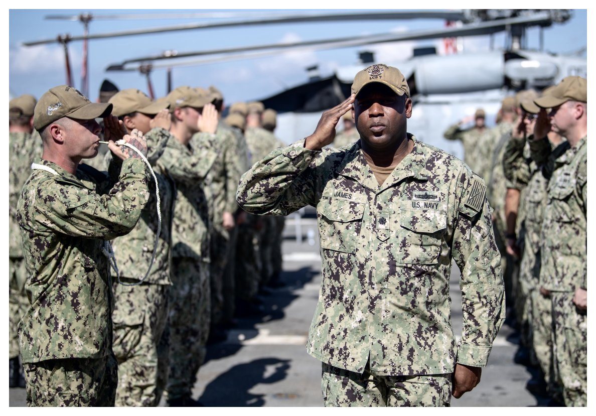 233k | 05 December 2019: Guantanamo Bay, Cuba - Commander Anthony James, commanding officer, is rendered honors during a change of command ceremony held on the flight deck of Detroit. (U.S. Navy photo VIRIN #191205-N-DW182-1111 by MC2 Devin Bowser from the Defense Visual Information Distribution Service) | ||