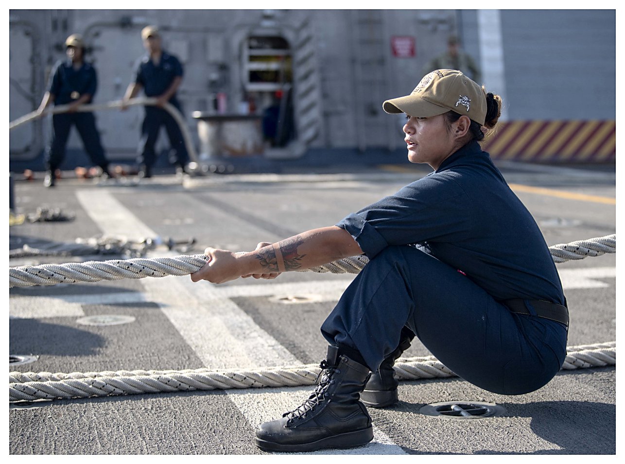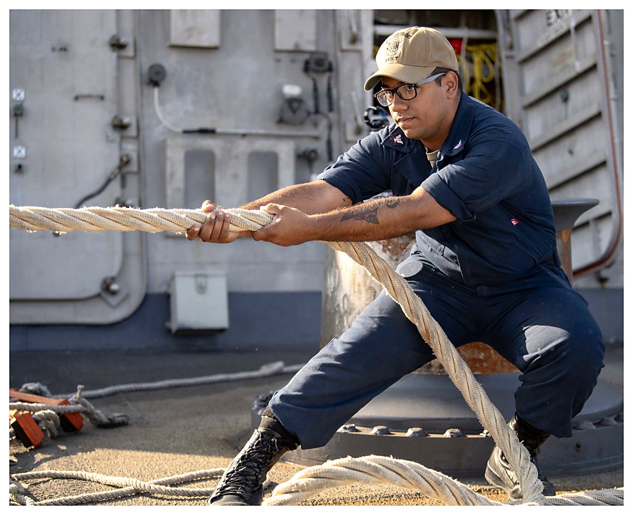 235k | 26 December 2019: Guantanamo Bay, Cuba - Gunner’s Mate 3rd Class Zacary Castro and Operations Specialist 1st Class Tina Jennings haul in mooring lines, during sea and