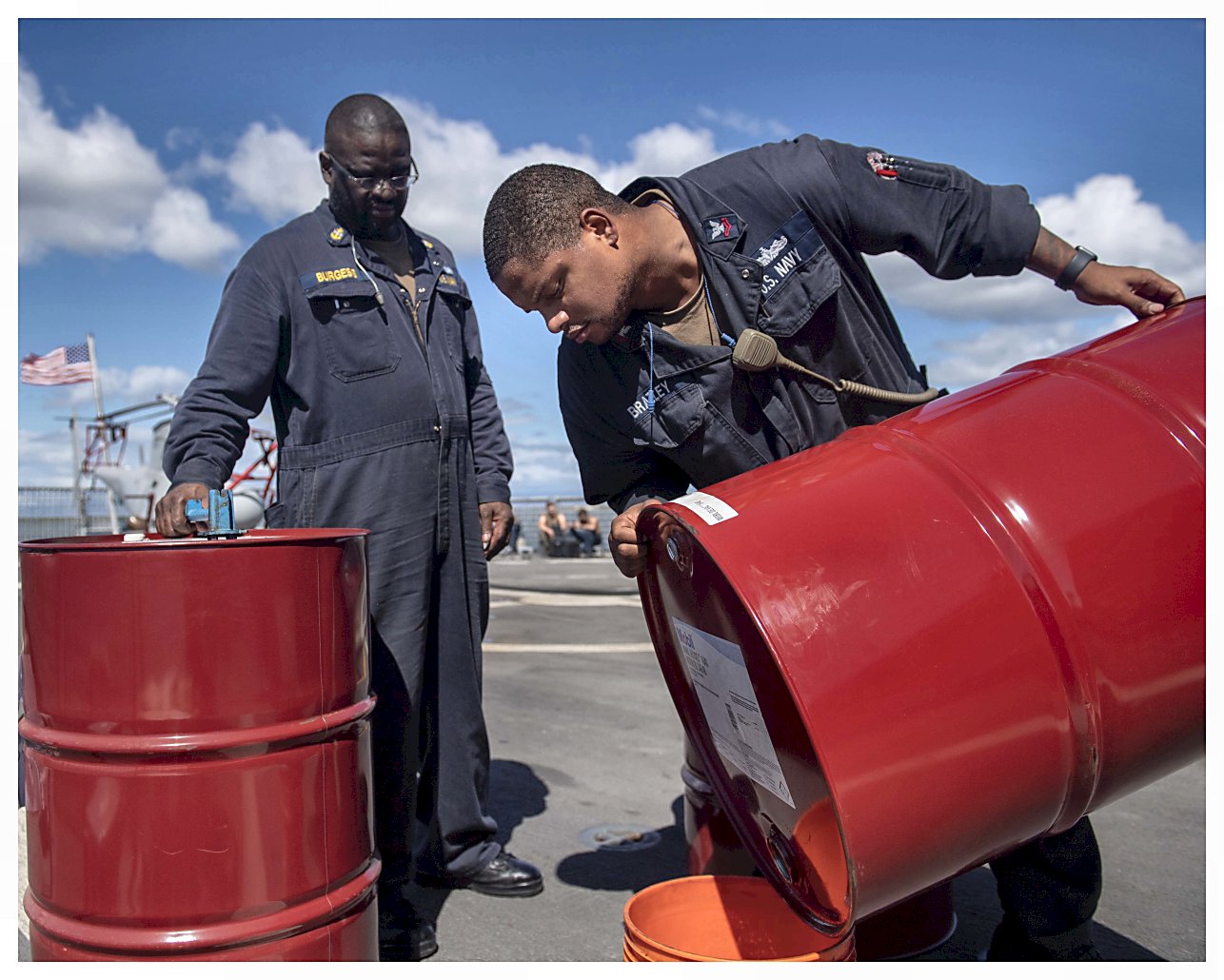 207k | 18 January 2020: Guantanamo Bay, Cuba - Chief Engineman Jamel Burgess (left) and Engineman 2nd Class John Brazley remove lube oil from a 55-gallon drum on the flight deck of