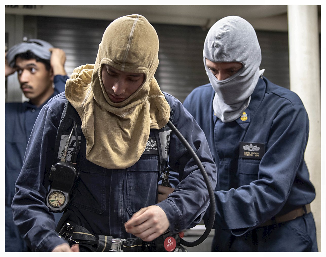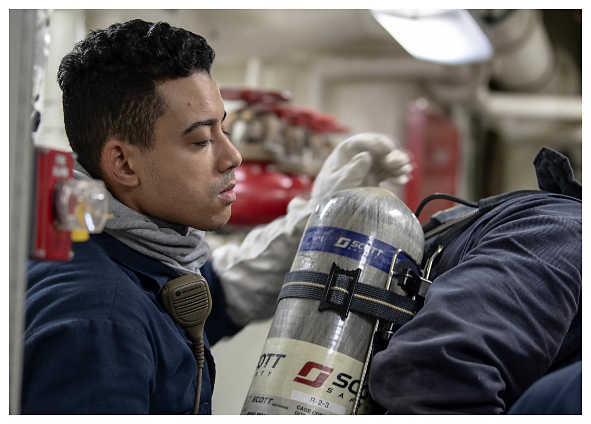 227k | 22 January 2020: The Atlantic Ocean - Culinary Specialist 2nd Class Johnathan Melendez dons a self-contained breathing apparatus (SCBA) as Engineman 2nd Class Andy