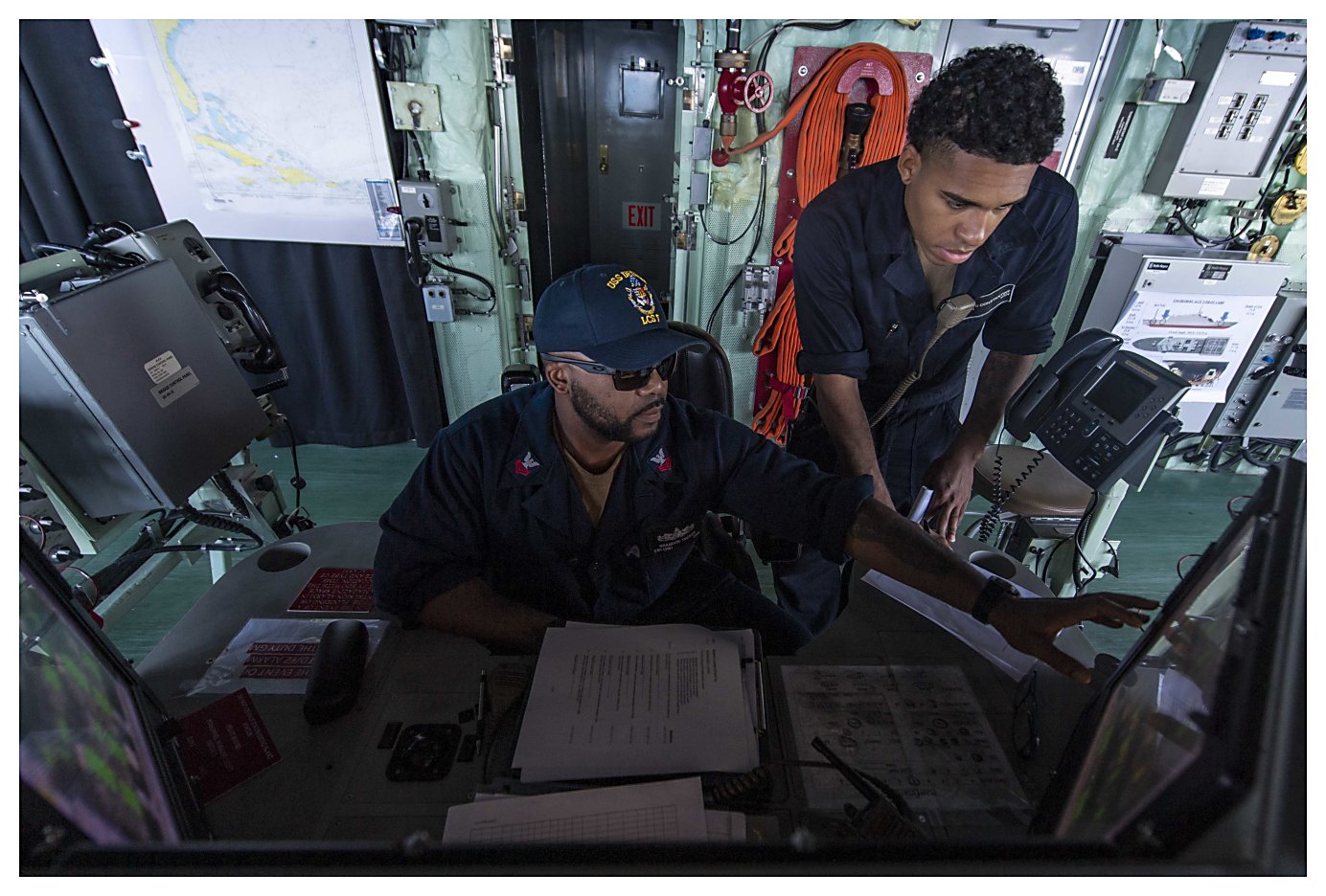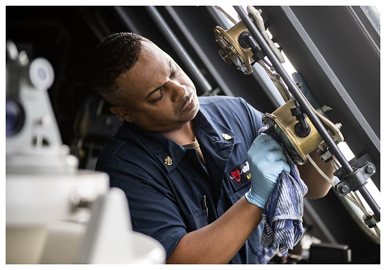 170k | 10 September 2020: The Caribbean Sea - Chief Quartermaster Earl Berry shines brass on the bridge aboard Detroit. (U.S. Navy photo VIRIN #200912-N-QI061-0001 by MC2 Nathan T. Beard from the Defense Visual Information Distribution Service) | ||