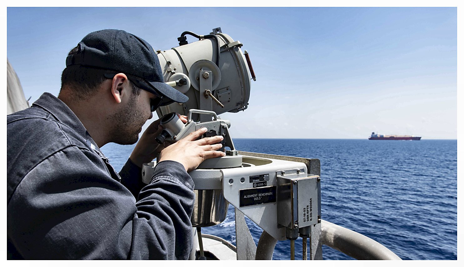 230k | 26 March 2020: The Caribbean Sea - Lt.(jg) Jose Garza takes a bearing of a nearby vessel from the port bridge wing of Detroit. (U.S. Navy photo VIRIN #200326-N-KK394-1199 by MC2 Anderson W. Branch from the Defense Visual Information Distribution Service) | ||