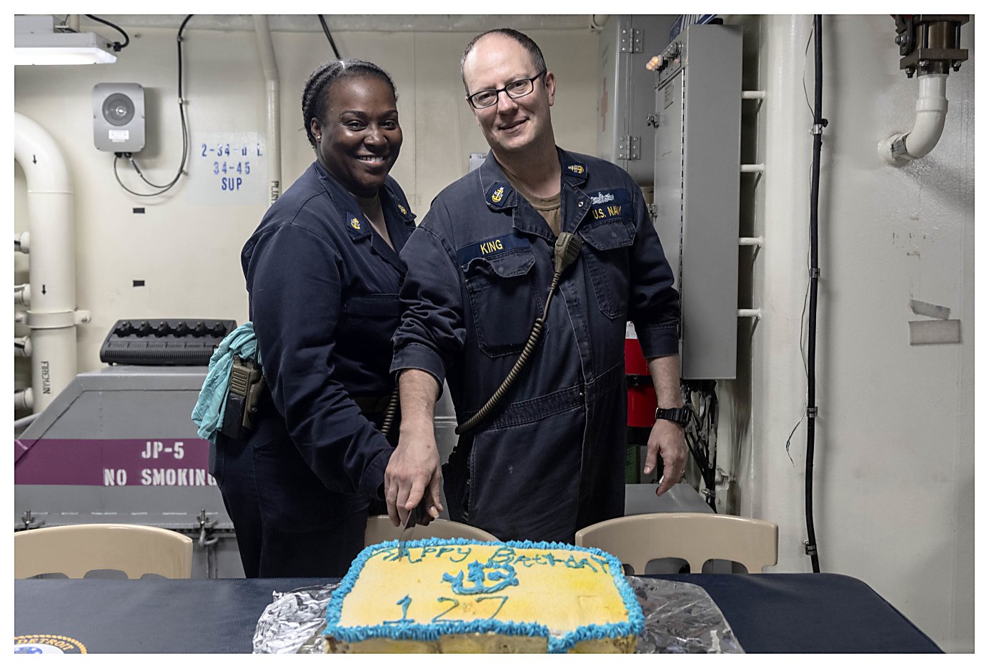 203k | 01 April 2020: Key West, Fla. - Chief Hospital Corpsman Bianca McQueen and Senior Chief Engineman Steven King cut a cake in celebration of 127 years of the Chief Petty Officer