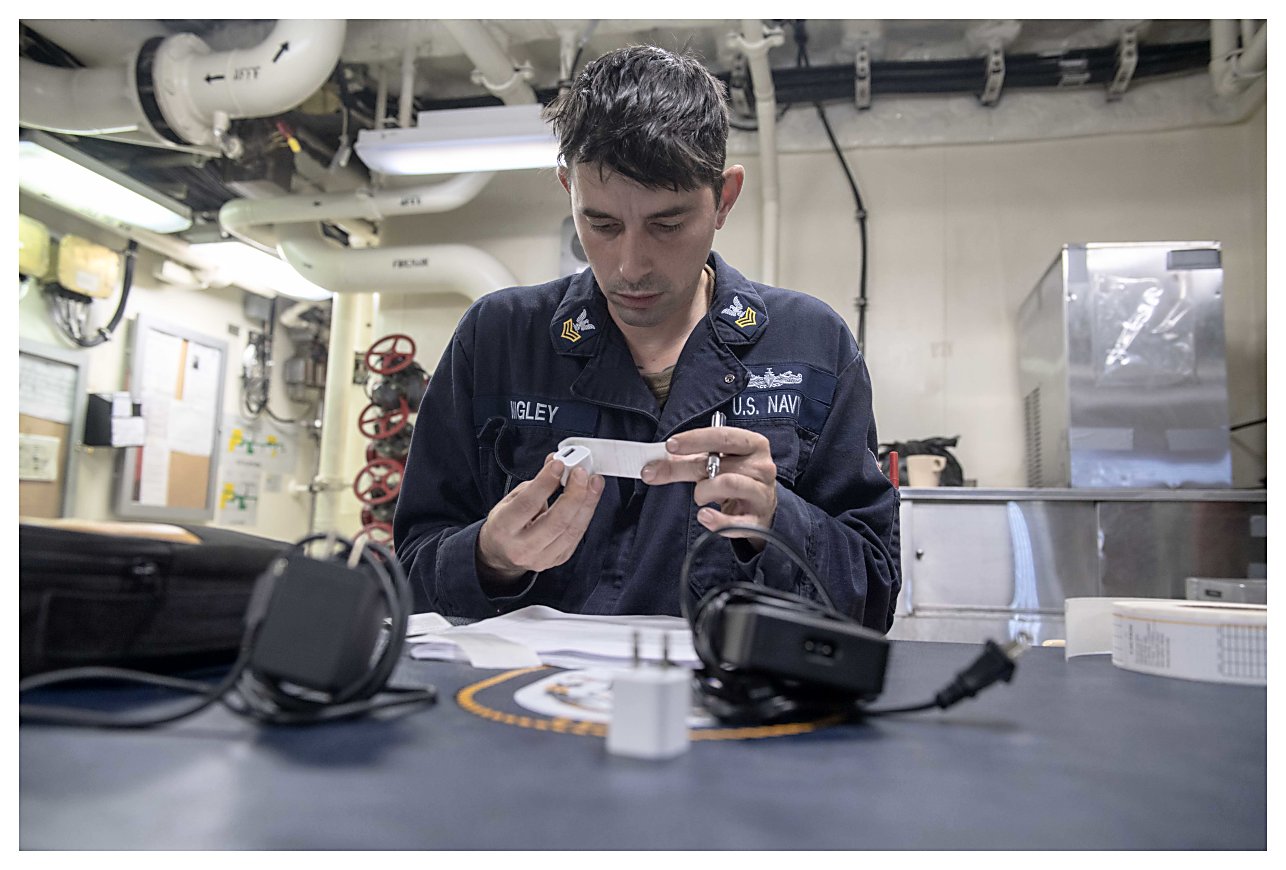 158k | 03 April 2020: Key West, Fla. - Gas Turbine System Technician (Electrical) 1st Class Sean Wigley conducts an electrical safety check on a power adapter on the mess decks of