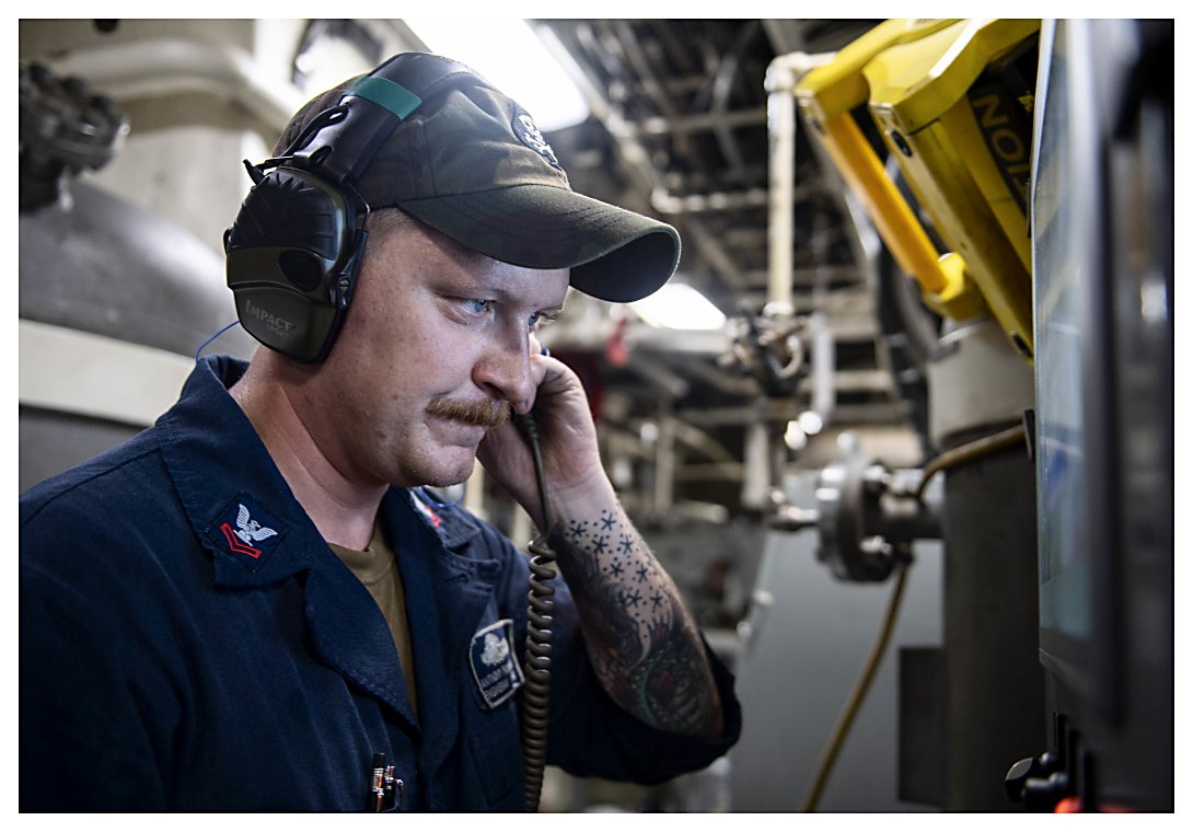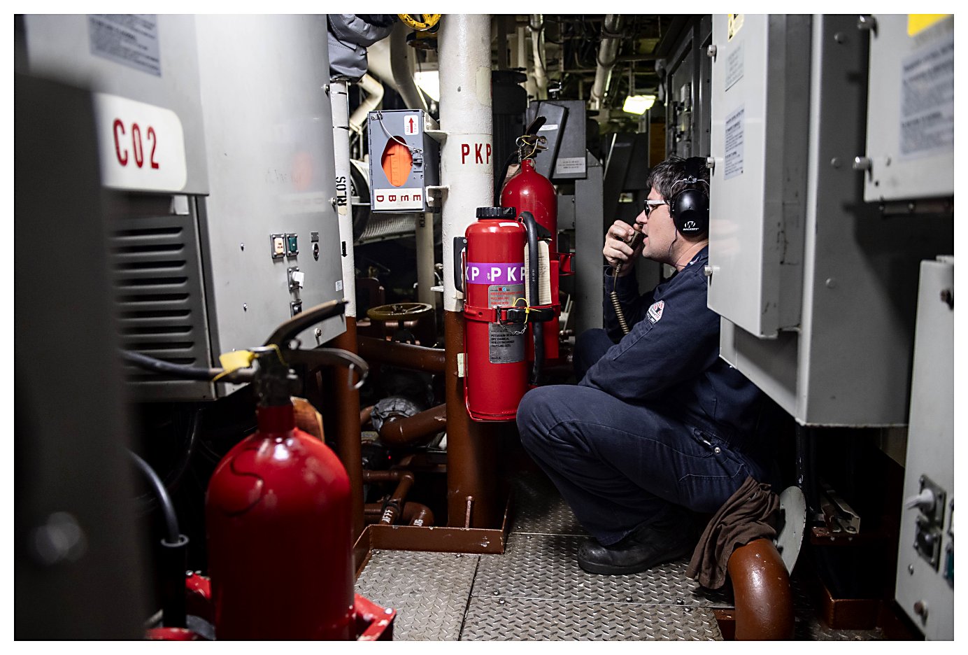212k | 09 September 2020: The Caribbean Sea - Hull Maintenance Technician 1st Class Chris McSwain communicates with Damage Control Central from the lower main machinery room aboard