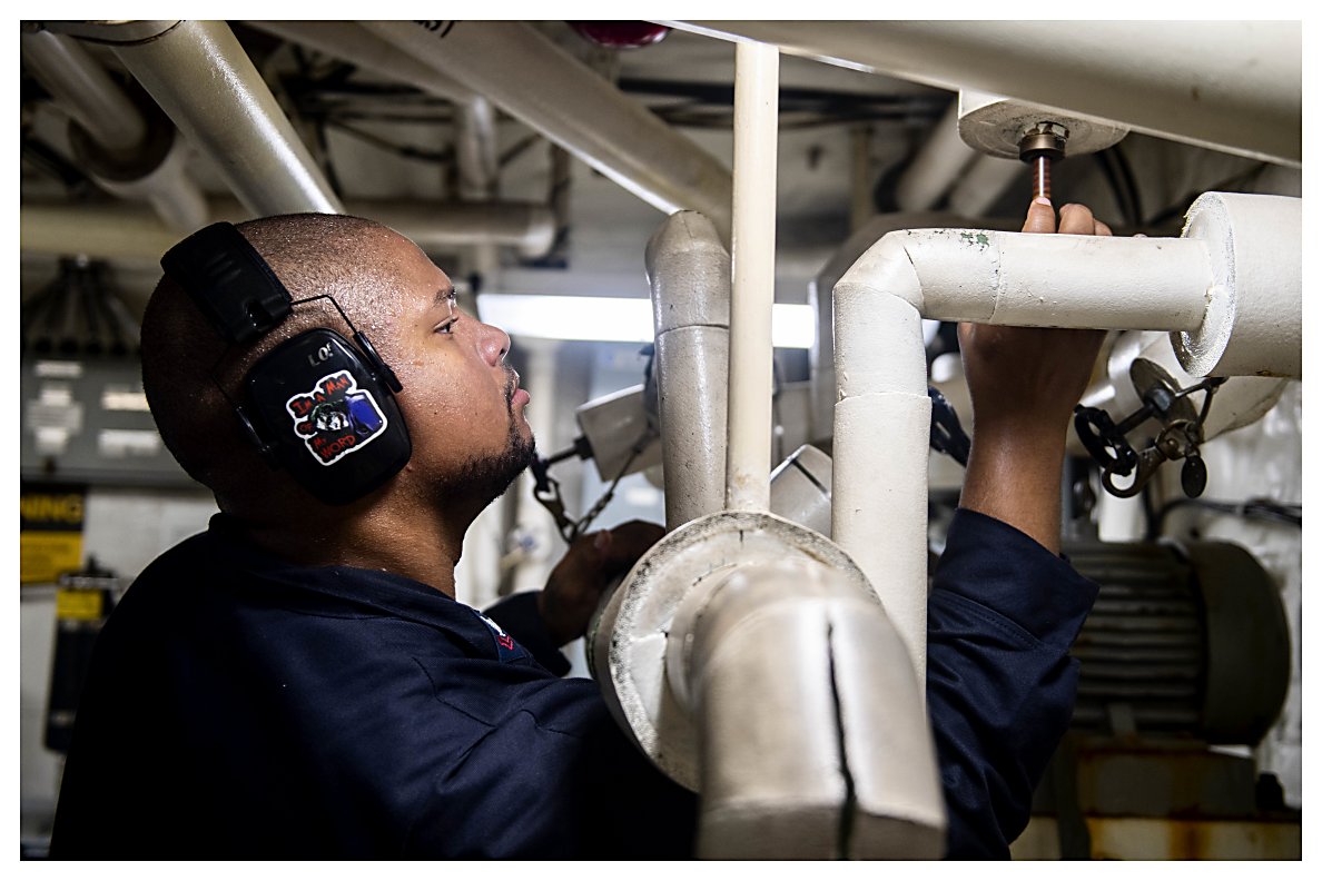 117k | 09 September 2020: The Caribbean Sea - Engineman 2nd Class Anthony Fuhrman inspects machinery in the main machinery room aboard Detroit. (U.S. Navy photo VIRIN #200909-N-QI061-0090 by MC2 Nathan T. Beard from the Defense Visual Information Distribution Service) | ||