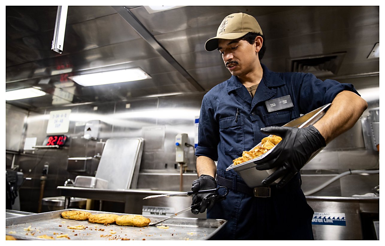 169k | 09 September 2020: The Caribbean Sea - Culinary Specialist Seaman Raul Campos prepares food in the galley aboard Detroit. (U.S. Navy photo VIRIN #200909-N-QI061-0004 by MC2 Nathan T. Beard from the Defense Visual Information Distribution Service) | ||