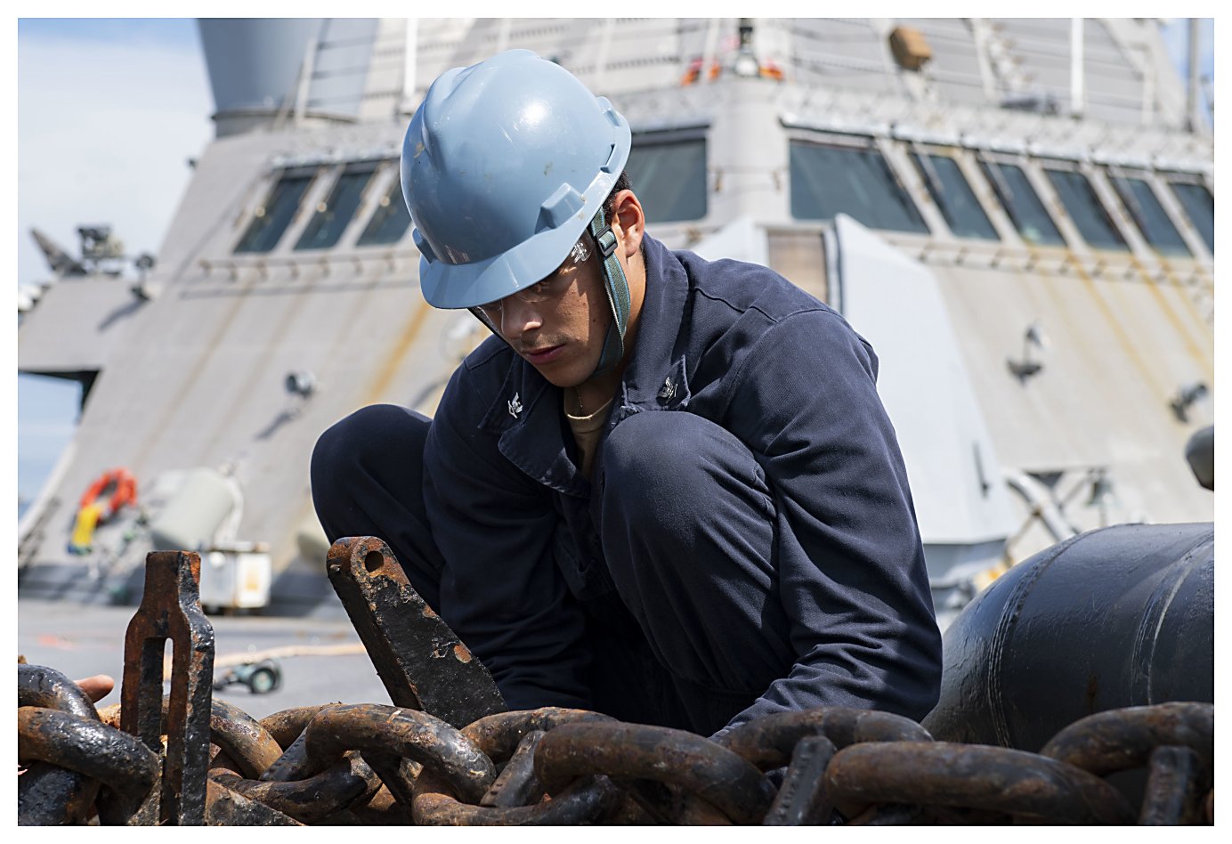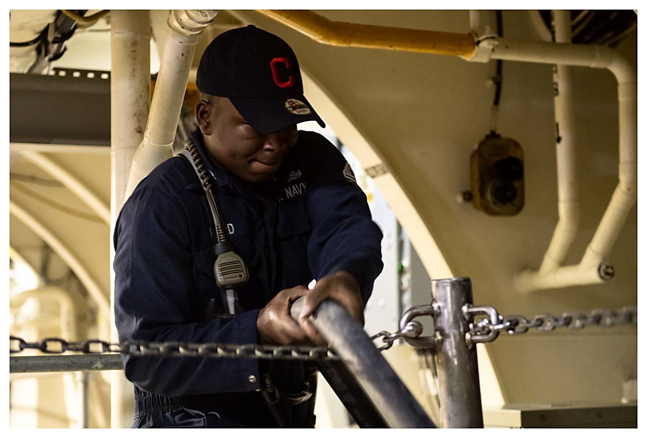 187k | 14 September 2020: Colon, Panama - Gunner’s Mate 3rd Class Hunter McRorie sets the riding stopper on the anchor chain aboard Detroit. (U.S. Navy photo VIRIN #200914-N-QI061-0212 by MC2 Nathan T. Beard from the Defense Visual Information Distribution Service) | ||