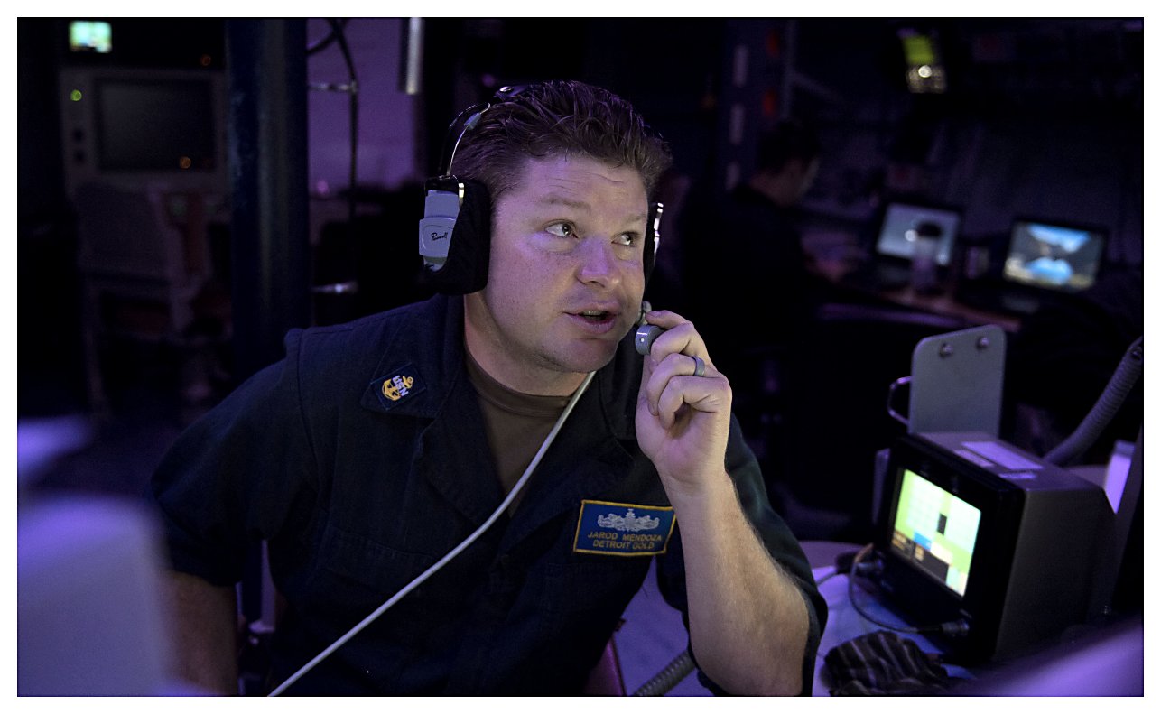 219k | 23 March 2020: The Caribbean Sea - Operations Specialist 1st Class Wes Alexander stands watch in the mission control center aboard Detroit. (U.S. Navy photo VIRIN #200323-N-KK394-1005 by MC2 Anderson W. Branch from the Defense Visual Information Distribution Service) | ||
