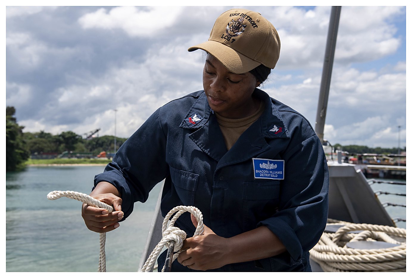 176k | 14 September 2020: Colon, Panama - Logistics Specialist 2nd Class Shacora Williams secures a rat guard to the mooring line aboard Detroit. (U.S. Navy photo VIRIN #200914-N-QI061-0371 by MC2 Nathan T. Beard from the Defense Visual Information Distribution Service) | ||