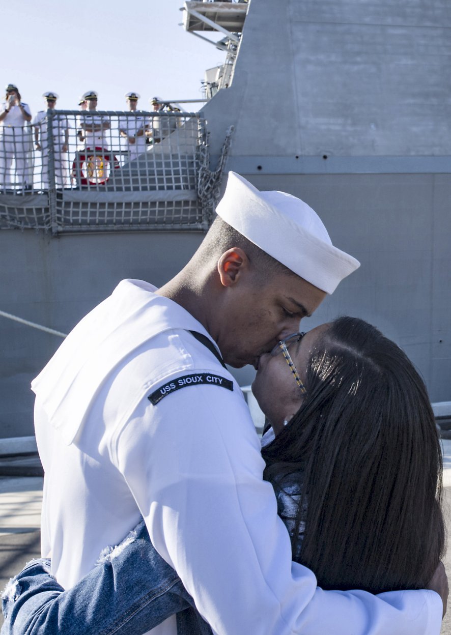 his wife following the ship's arrival to its homeport in Mayport, Fla. Sioux City is the thirteenth littoral combat ship to enter the fleet and the sixth of the Freedom variant.
