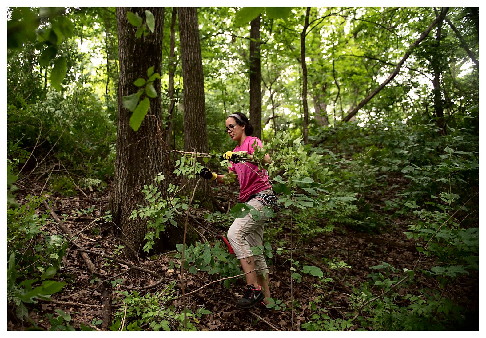 Sioux City, blue crew, clear invasive plants in the Illiniwek Forest Preserve during a community relations event during Quad Cities Navy Week. Navy Weeks are a series of