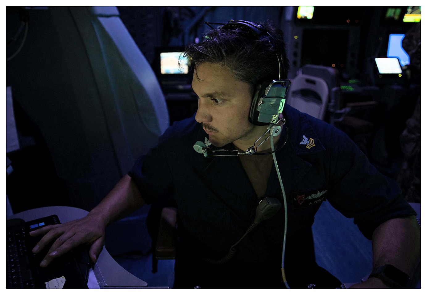 143k | 26 April 2021: The Caribbean Sea - Fire Controlman 1st Class Adam Perez stands Defense Systems Operator (DSO) watch in the Mission Control Center (MCC) as