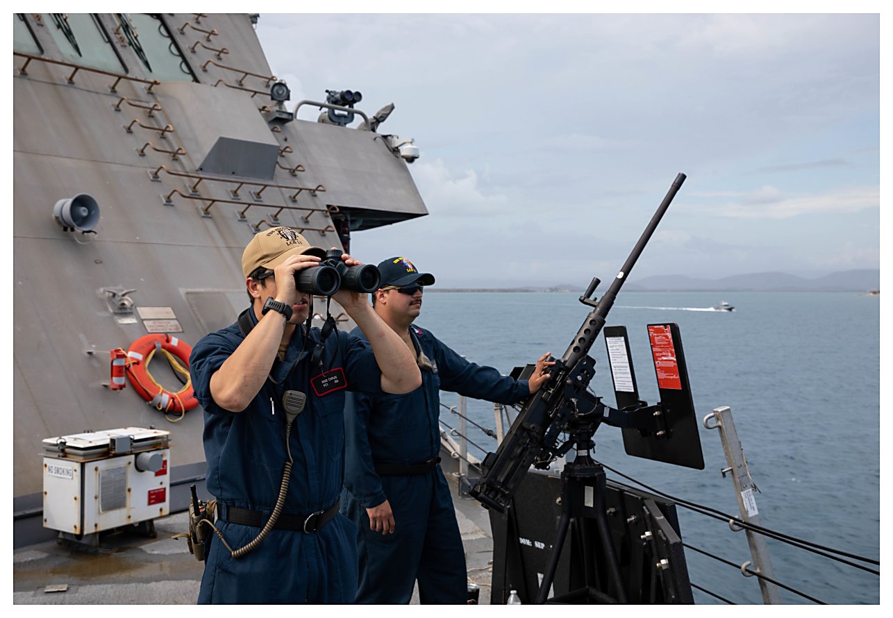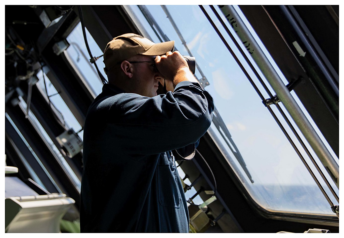 195k | 26 April 2021: The Caribbean Sea - Boatswain’s Mate 1st Class Nicholas Wendell stands lookout on the bridge of Sioux City. (U.S. Navy photo #210414-N-RL695-2015 by MC2 Marianne Guemo from the Defense Visual Information Distribution Service) | ||