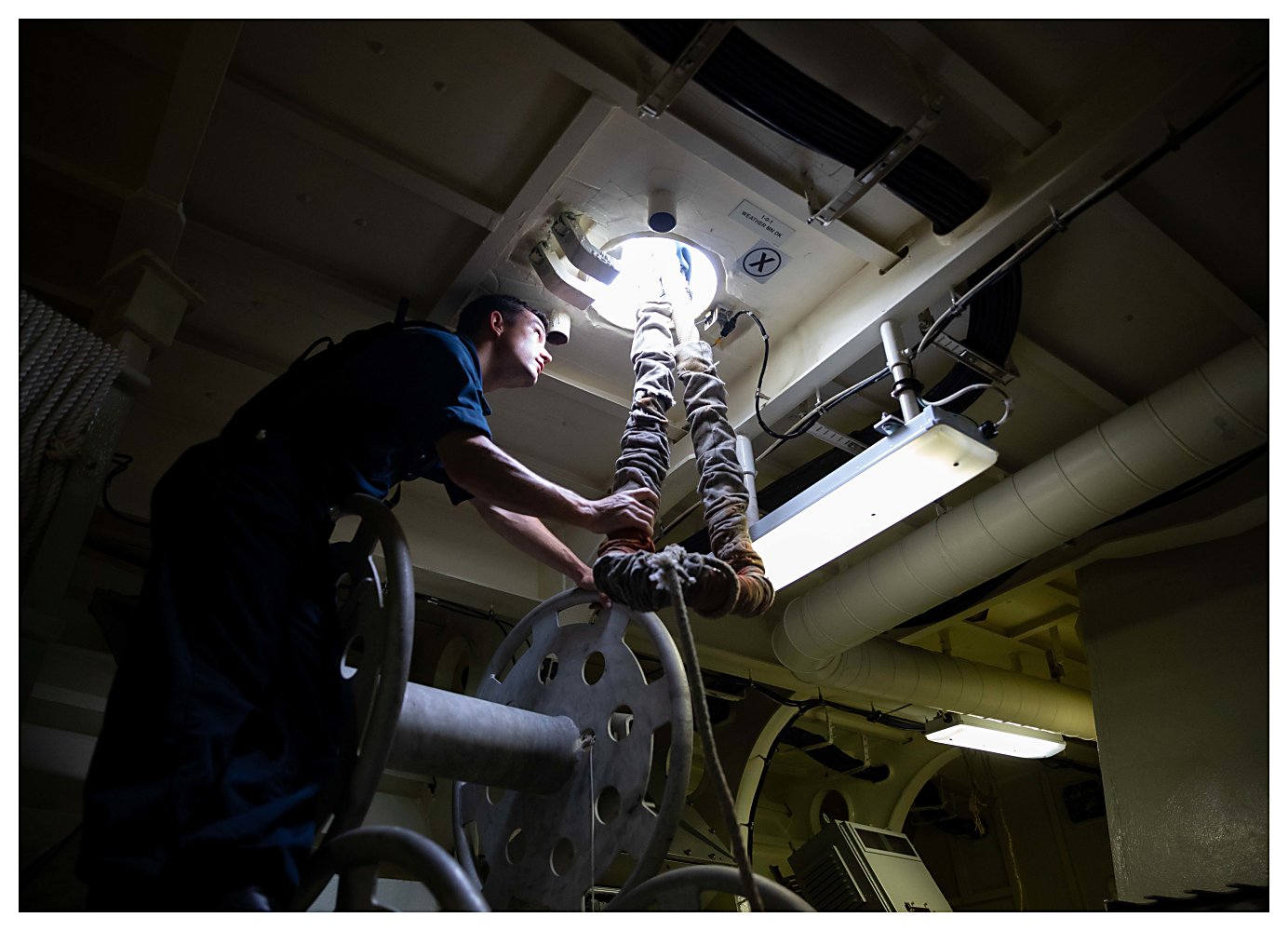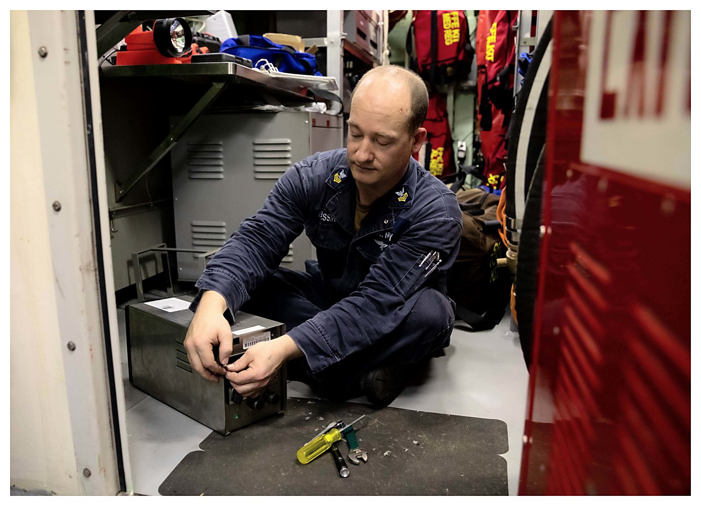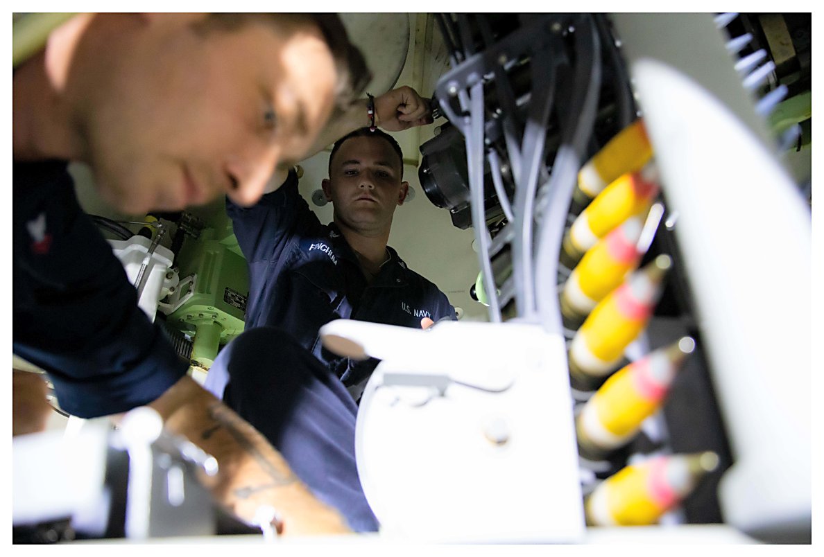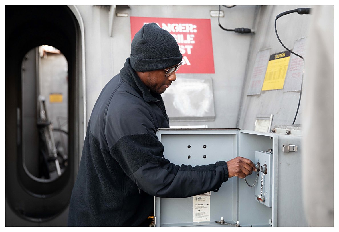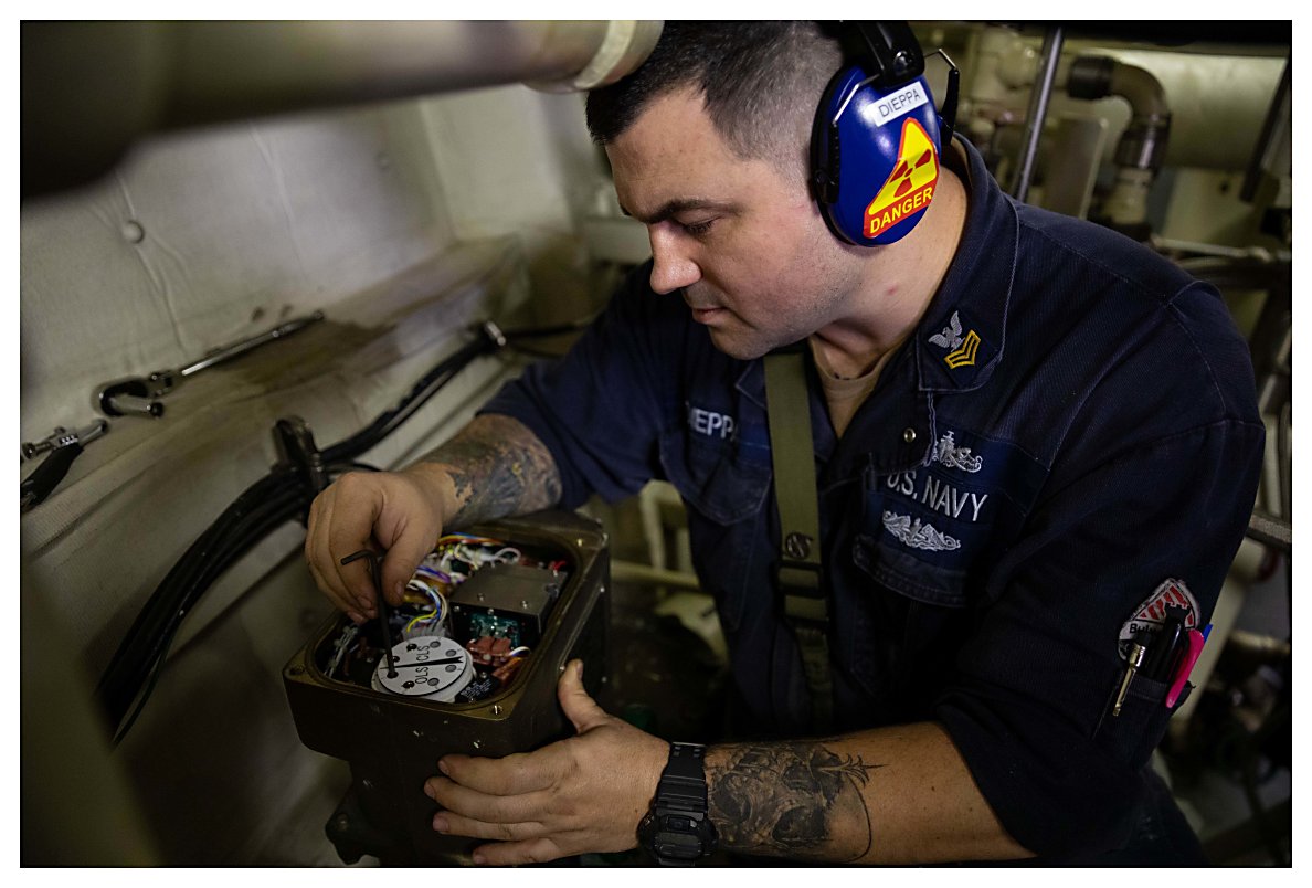 223k | 04 May 2021: The Caribbean Sea - Electrician’s Mate 1st Class Elijah Blessing conducts maintenance on a data acquisition unit (DAU) in a damage control locker of Sioux City. (U.S. Navy photo #210504-N-RL695-1001 by MC2 Marianne Guemo from the Defense Visual Information Distribution Service) | ||