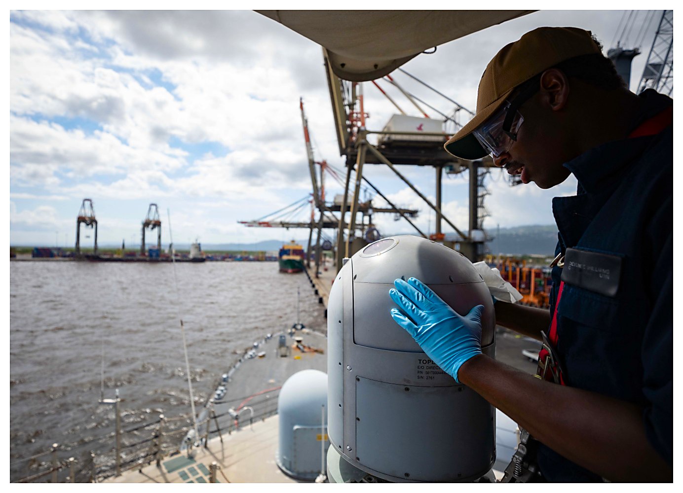 180k | 07 May 2021: Kingston, Jamaica - Gunner’s Mate 3rd Class Devunte Williams conducts maintenance on the Electronic Optical Sight (EOS) on the forward mast while the ship is