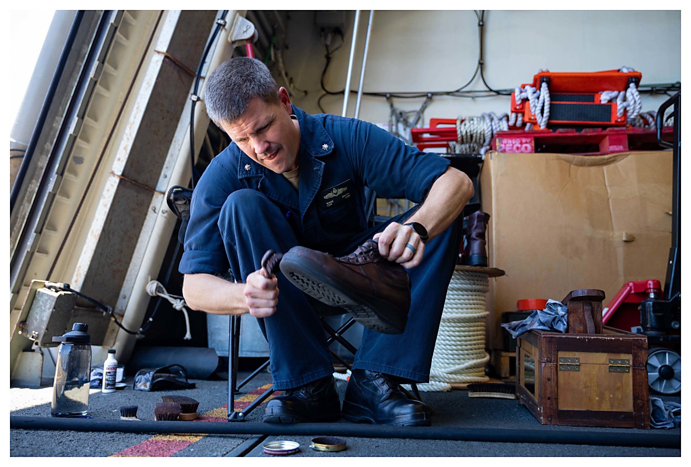 245k | 09 May 2021: The Caribbean Sea - Commander Wade Smith, commanding officer of USS Sioux City, helps shine sailors’ boots in the airborne mission zone to boost morale. (U.S. Navy photo #210509-N-RL695-1030 by MC2 Marianne Guemo from the Defense Visual Information Distribution Service) | ||