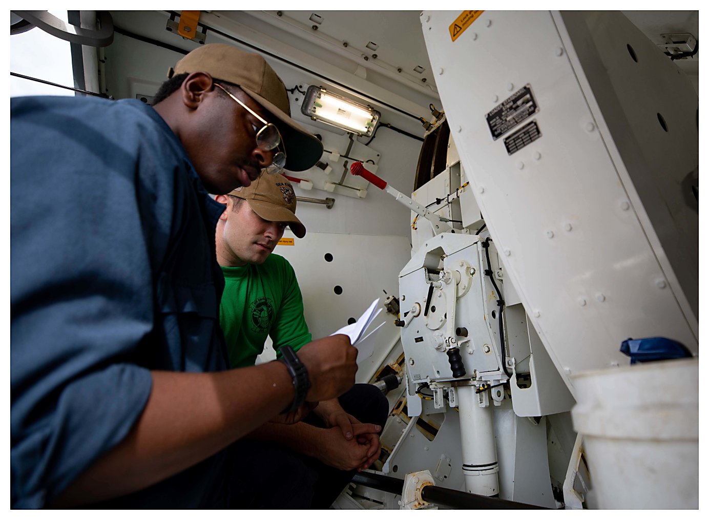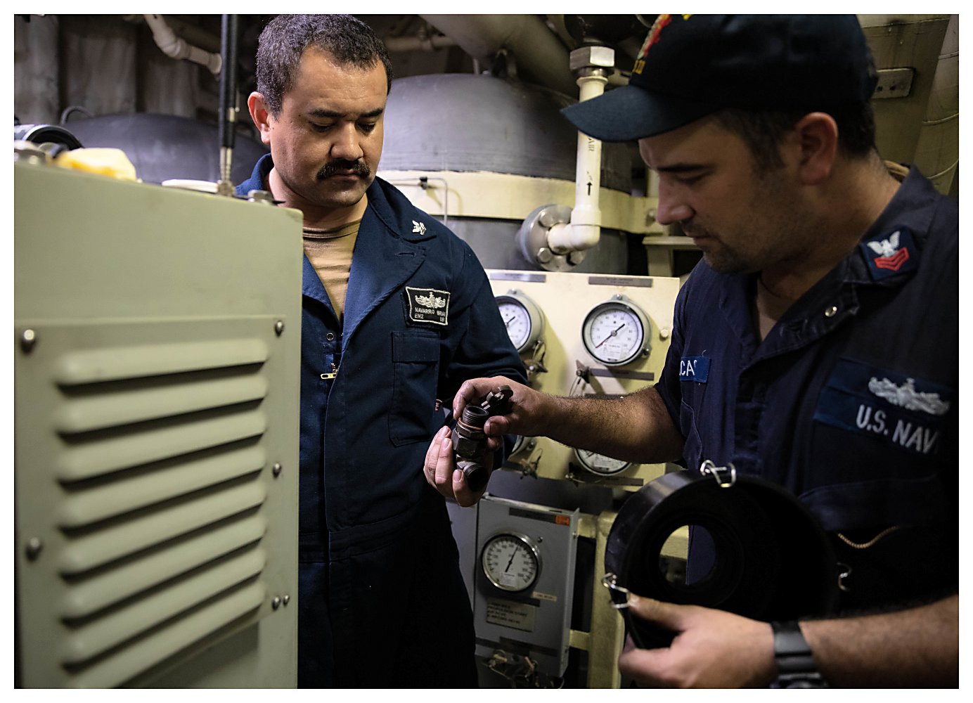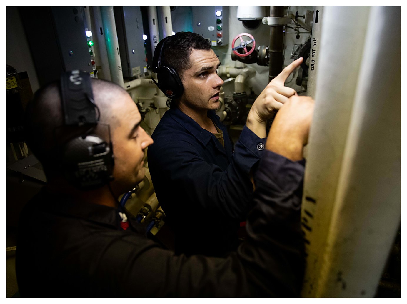 184k | 01 June 2021: Ponce, Puerto Rico - Engineman 1st Class Dillon Lucas, right, and Engineman 2nd Class Brian Navarro conduct maintenance in the main machinery