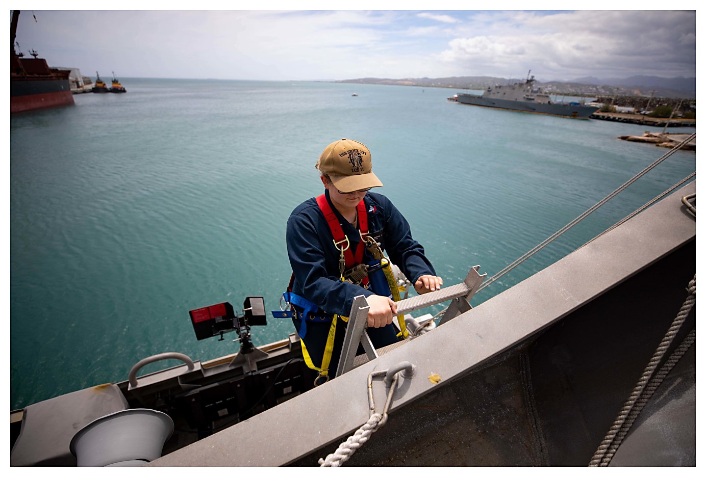 180k | 12 May 2021: Ponce, Puerto Rico - Electronics Technician 2nd Class Kattie Smith climbs aloft to conduct maintenance on a radar while the ship is in port Ponce, Puerto