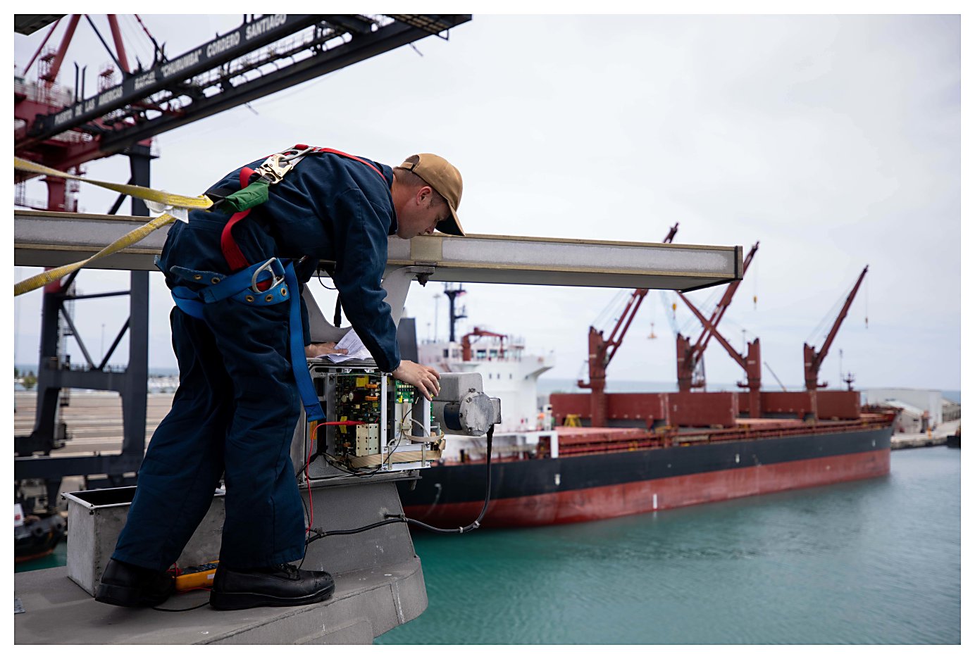 277k | 02 June 2021: Ponce, Puerto Rico - Engineman 1st Class Dillon Lucas, left, holds a crane basket steady, as sailors replace the mast lightbulb, while the ship is in
