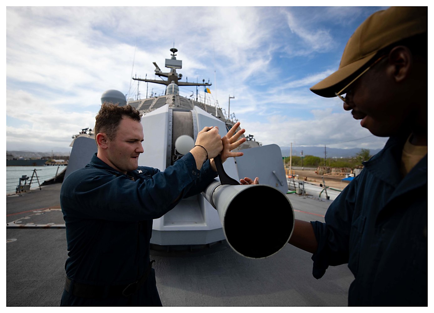146k | 12 May 2021: Ponce, Puerto Rico - Gunner’s Mate 3rd Class Lance Finchum, left, and Gunner’s Mate 3rd Class Devunte Williams, conduct maintenance on the 57mm MK 110 gun aboard