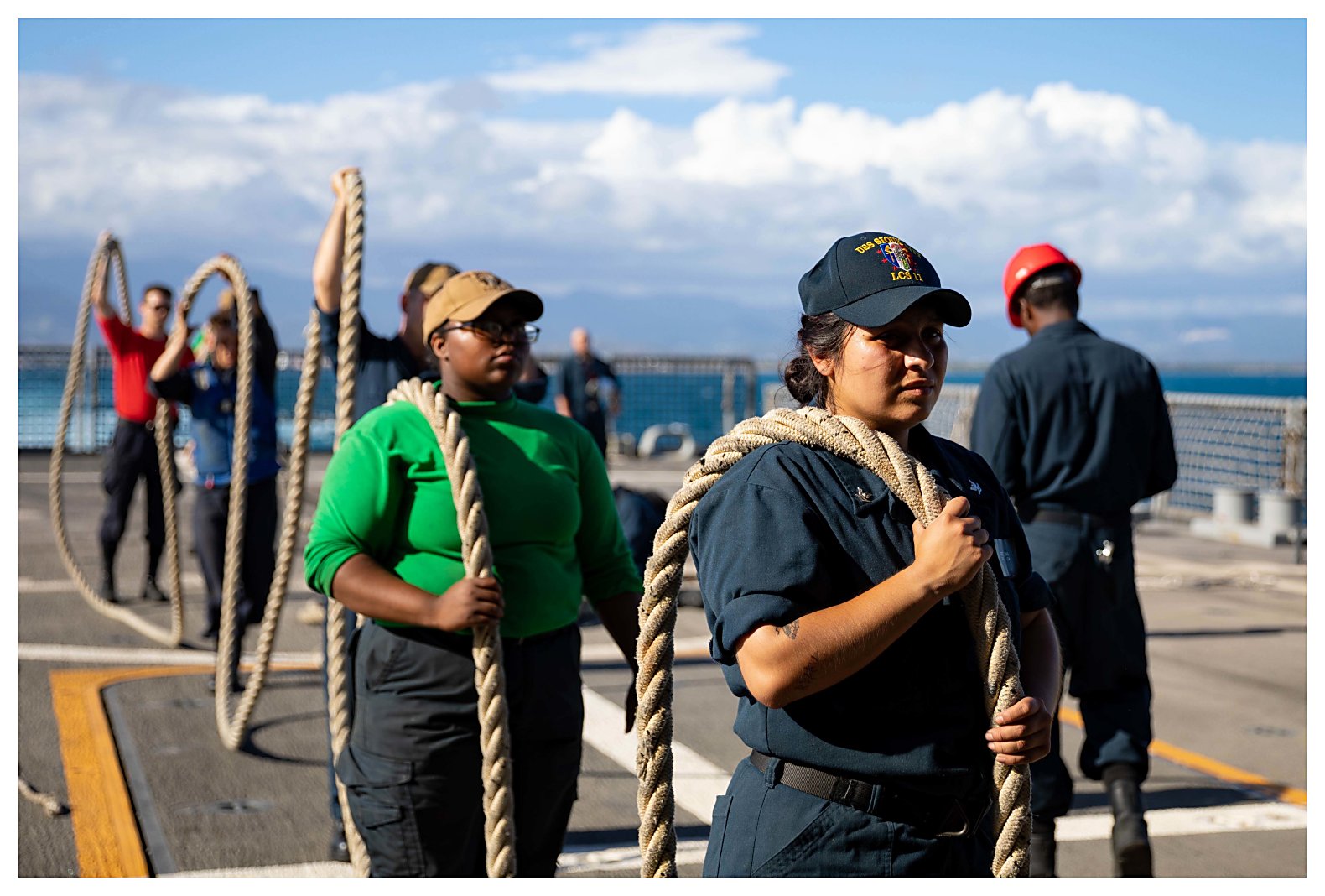 242k | 14 May 2021: Ponce, Puerto Rico - Sailors assigned to Sioux City stow lines after departing Ponce, Puerto Rico, following a brief stop for fuel and provisions. (U.S. Navy photo #210514-N-RL695-1112 by MC2 Marianne Guemo from the Defense Visual Information Distribution Service) | ||