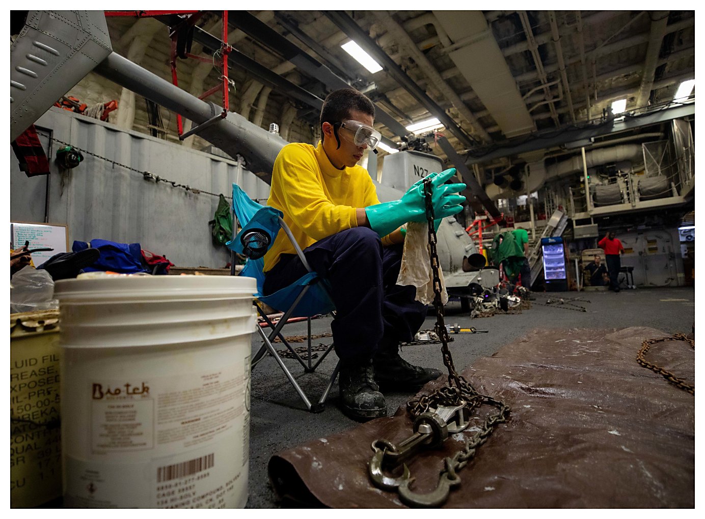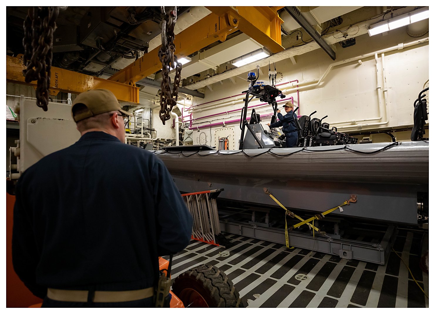 273k | 24 May 2021: The Caribbean Sea - Boatswain’s Mate Seaman Rudy Nieves performs maintenance on tie-down chains in the airborne mission zone (AMZ). (U.S. Navy photo #210524-N-RL695-1014 by MC2 Marianne Guemo from the Defense Visual Information Distribution Service) | ||
