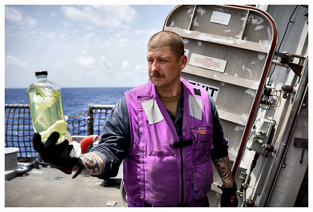 206k | 25 May 2021: The Caribbean Sea - Chief Warrant Officer 3 Michael Vick inspects a fuel sample on the flight deck. (U.S. Navy photo #210525-N-RL695-1082 by MC2 Marianne Guemo from the Defense Visual Information Distribution Service) | ||