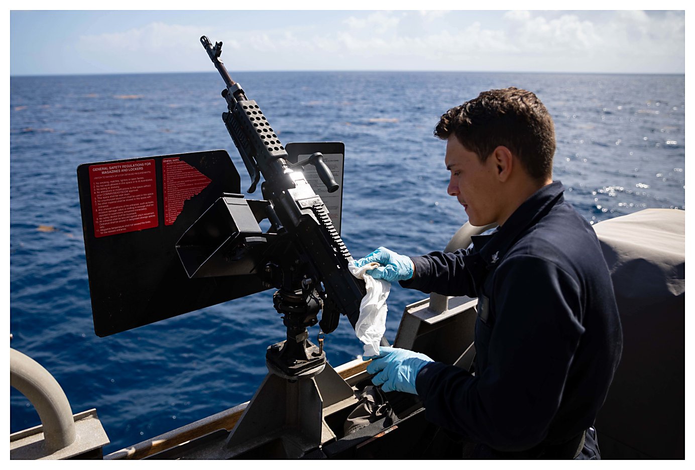 187k | 29 May 2021: The Caribbean Sea - Gunner’s Mate 3rd Class Cody Harris conducts maintenance on an M240B machine gun on the bridge wing aboard Sioux City. (U.S. Navy photo #210529-N-RL695-1004 by MC2 Marianne Guemo from the Defense Visual Information Distribution Service) | ||