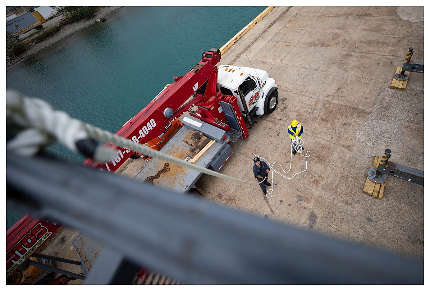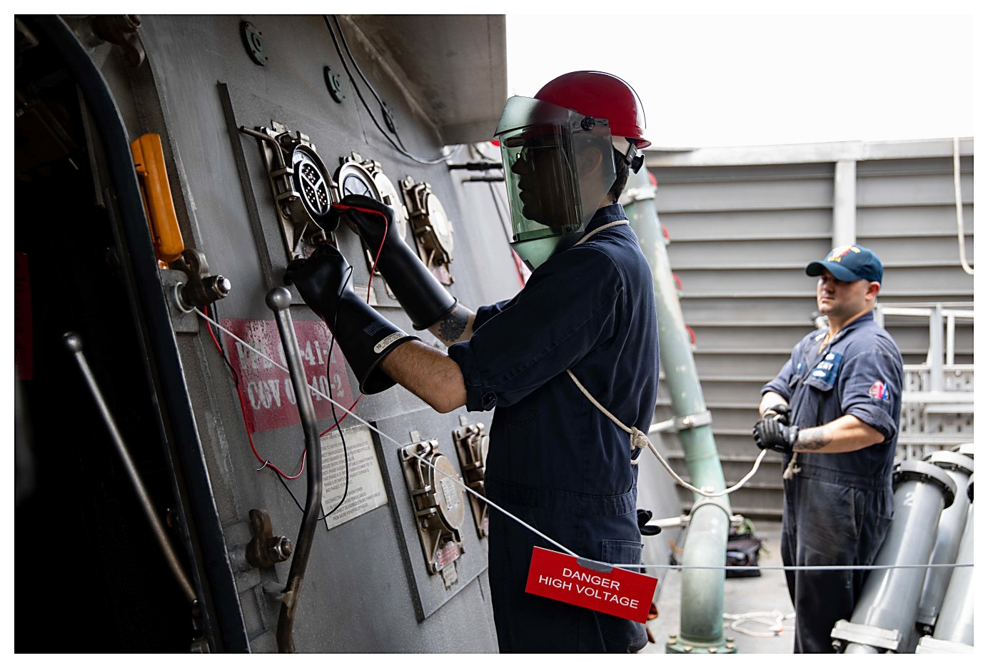 connect the ship to shore power while in port Ponce, Puerto Rico, for a planned maintenance availability (PMAV). (U.S. Navy photo #210530-N-RL695-1202 by MC2 Marianne Guemo from the Navy News Stand) | ||