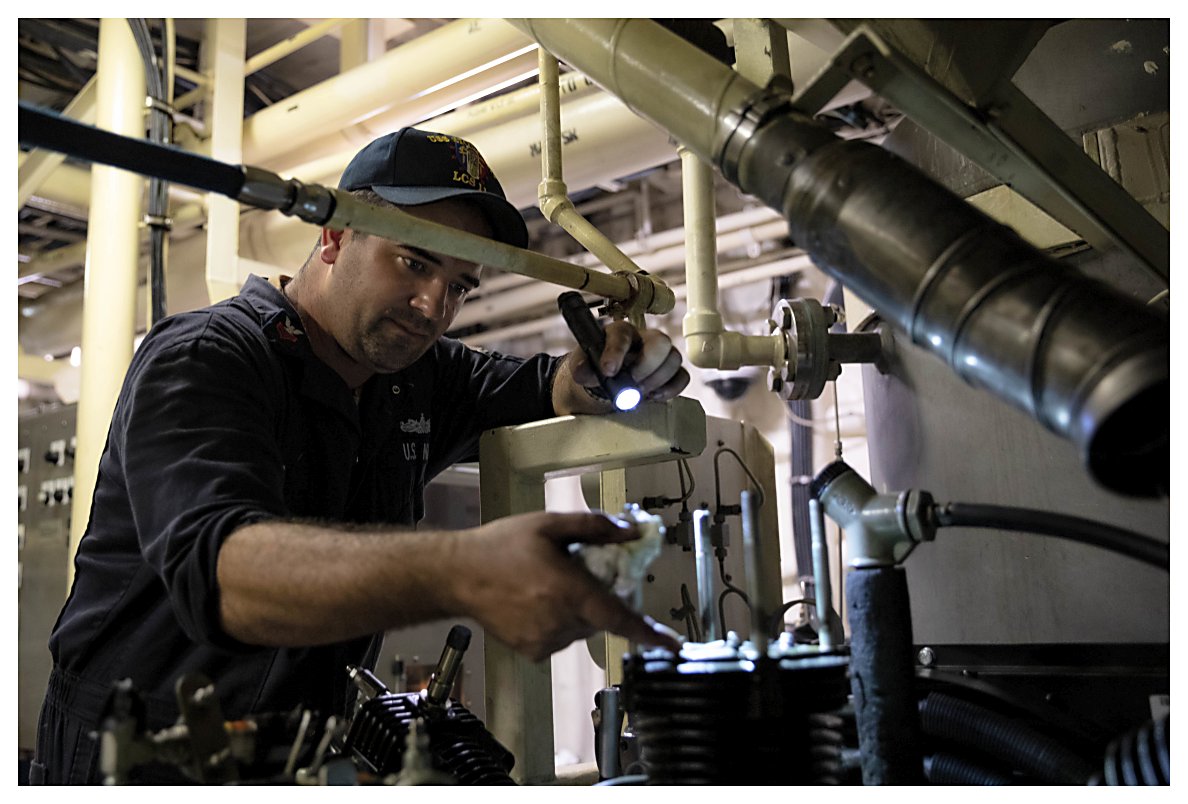 152k | 01 June 2021: Ponce, Puerto Rico - Engineman 1st Class Dillon Lucas conducts maintenance in the main machinery room, while the ship