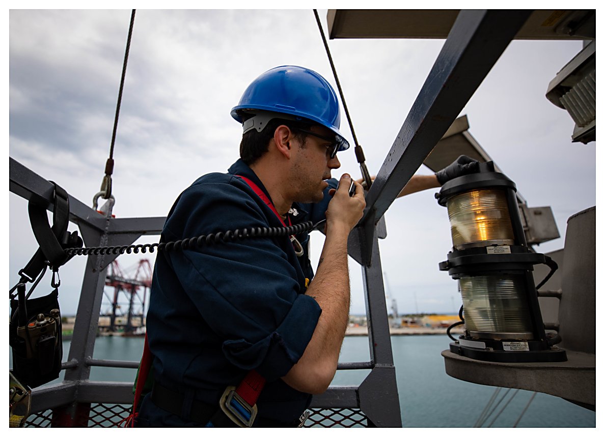 144k | 02 June 2021: Ponce, Puerto Rico - Electrician’s Mate 1st Class David Ordoyne replaces a lightbulb on the mast while the ship is