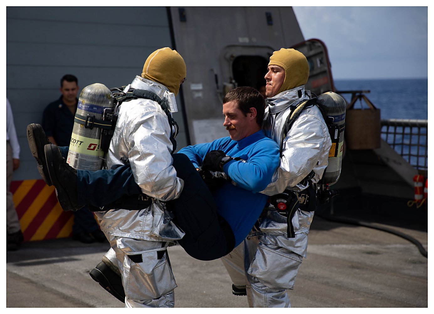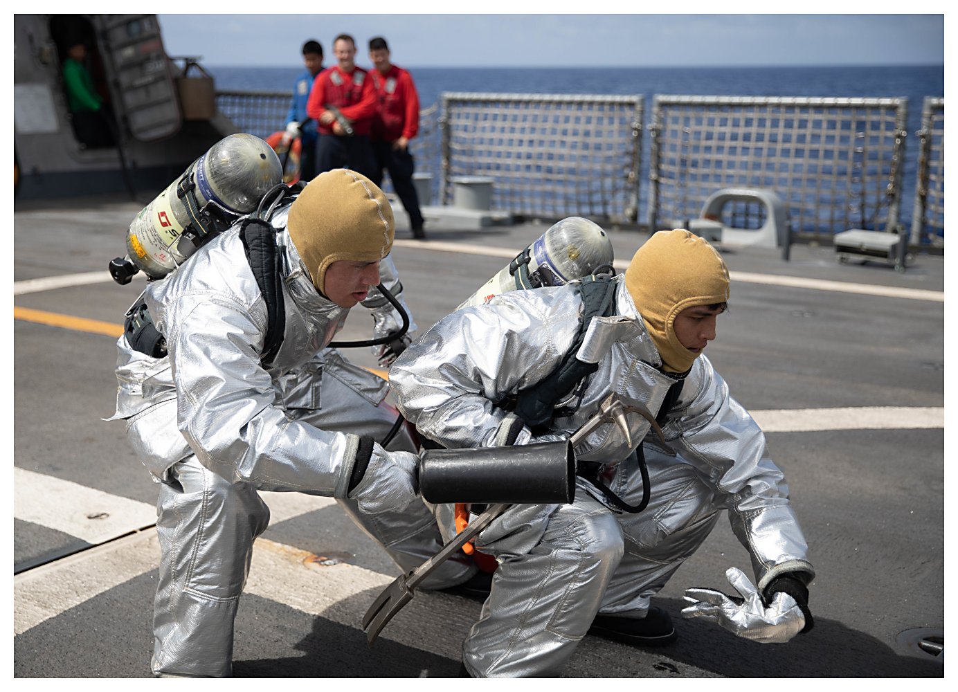 270k | 09 June 2021: The Caribbean Sea - Fire Controlman 1st Class Carlos Ruiz, left, and Operations Specialist 1st Class Keith Samayo conduct aviation firefighting drills