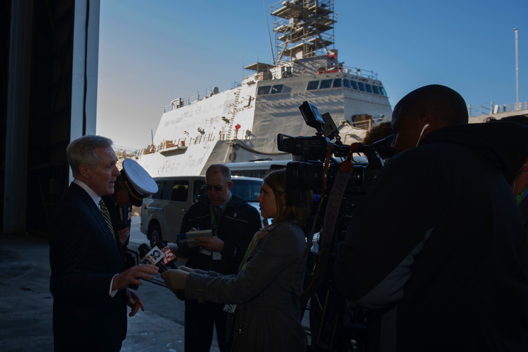 156k | 19 December 2015: Mobile, Ala. – Secretary of the Navy Ray Mabus speaks to the media before the christening ceremony of the Navy's newest Independence-variant