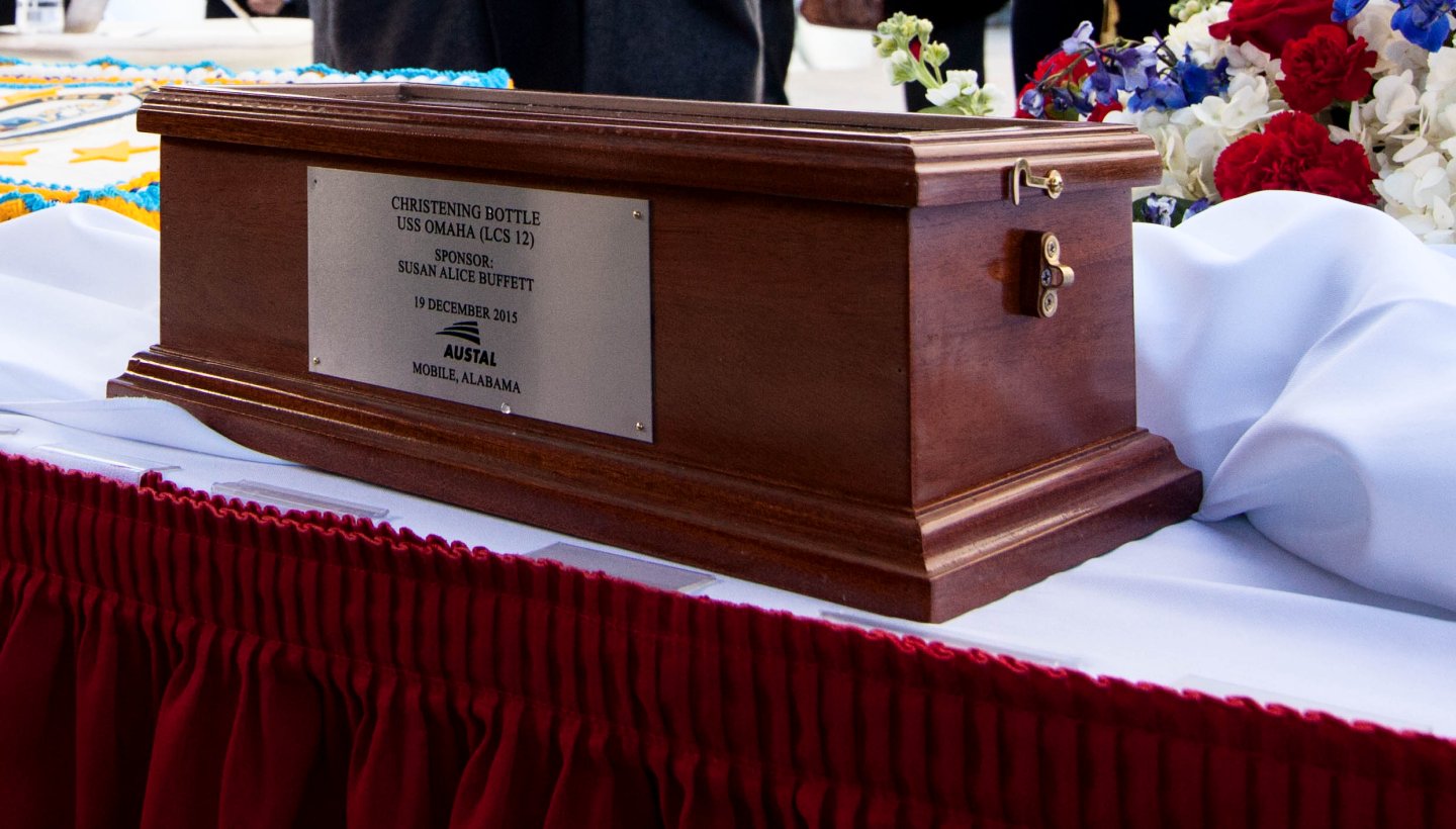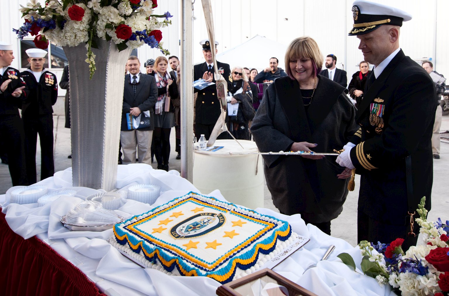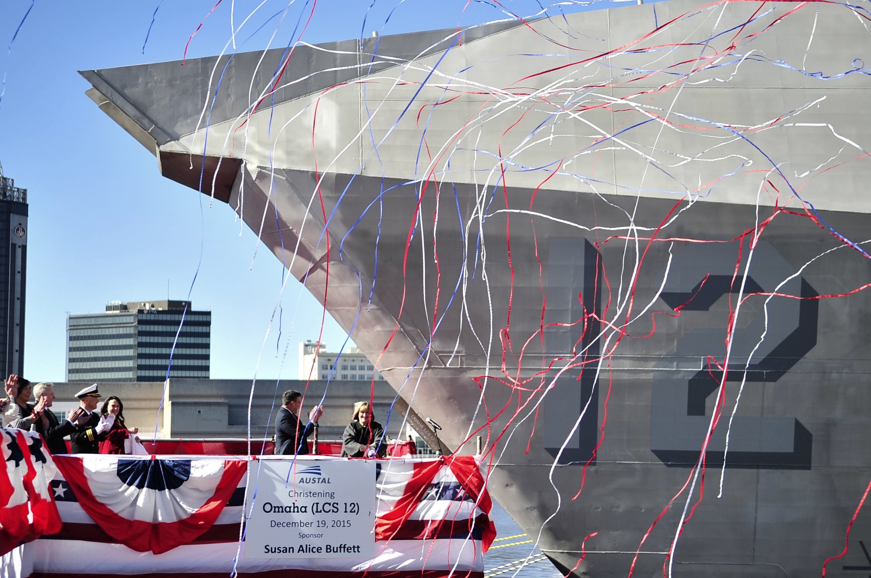 329k | 19 December 2015: Mobile, Ala. – Susan A. Buffett, ship's sponsor for the littoral combat ship Pre-Commissioning Unit, Omaha (LCS 12), breaks a