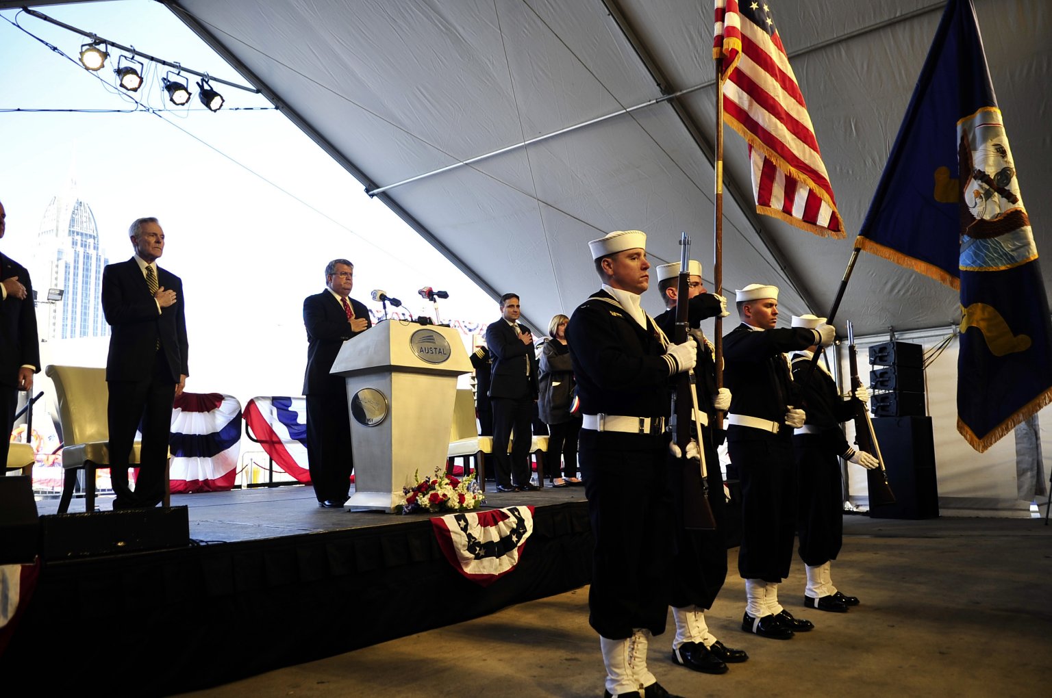 Battalion (NMCB) 11 presents the colors during the christening ceremony for the Navy's newest littoral combat ship, USS Omaha (LCS 12), in Mobile, Ala. (U.S. Navy photo #151219-N-OR477-067 by MC1 Michael C. Barton from the Navy Newstand) | ||