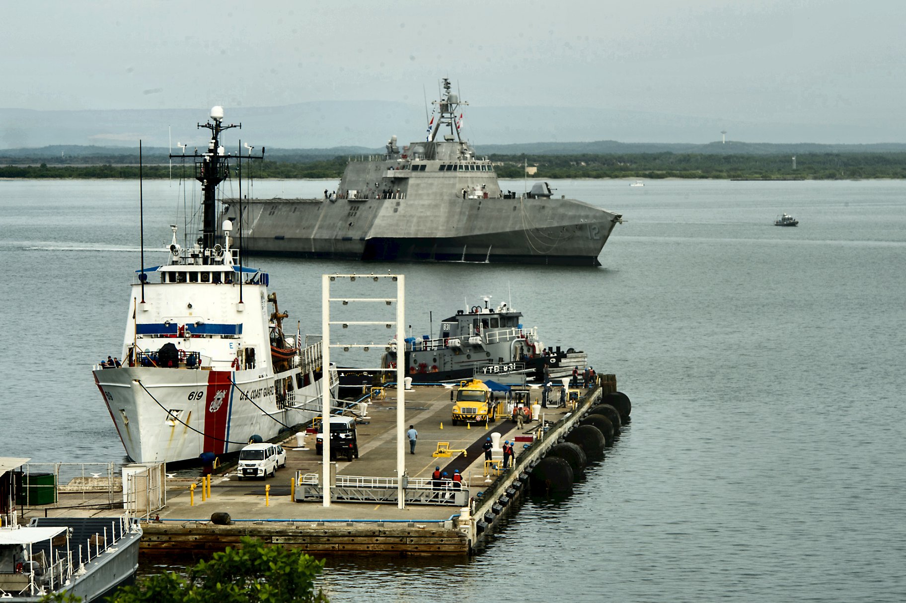 3.) 383k03 January 2018: Guantanamo Bay, Cuba – 1.) The future USS Omaha (LCS 12), the Navy's newest littoral combat ship, passes the USCGC Confidence (WMEC-619), a United States Coast Guard medium endurance cutter, as it sits pierside at Naval Station Guantanamo Bay during a brief fuel stop. Omaha is conducting a change of homeport to San Diego. 2.) A Naval Station Guantanamo Bay Port Operations vessel prepares to assist the future USS Omaha (LCS 12), a littoral combat ship, pierside at the installation during a brief fuel stop. 3.) The future USS Omaha (LCS 12), a littoral combat ship, sits pierside at Naval Station Guantanamo Bay during a brief fuel stop. Omaha is conducting change of homeport to San Diego. Naval Station Guantanamo Bay provides support to the U.S. Navy and U.S. Coast Guard vessels, and partner navies in the Caribbean operating area. (U.S. Navy photo #180103-N-TP834-003, 180103-N-TP834-087, and #180103-N-TP834-149 by MC1 John Philip Wagner, Jr. from the Navy Newstand) 1.) 1512020 2.) 1512021 3.) 1512022 |